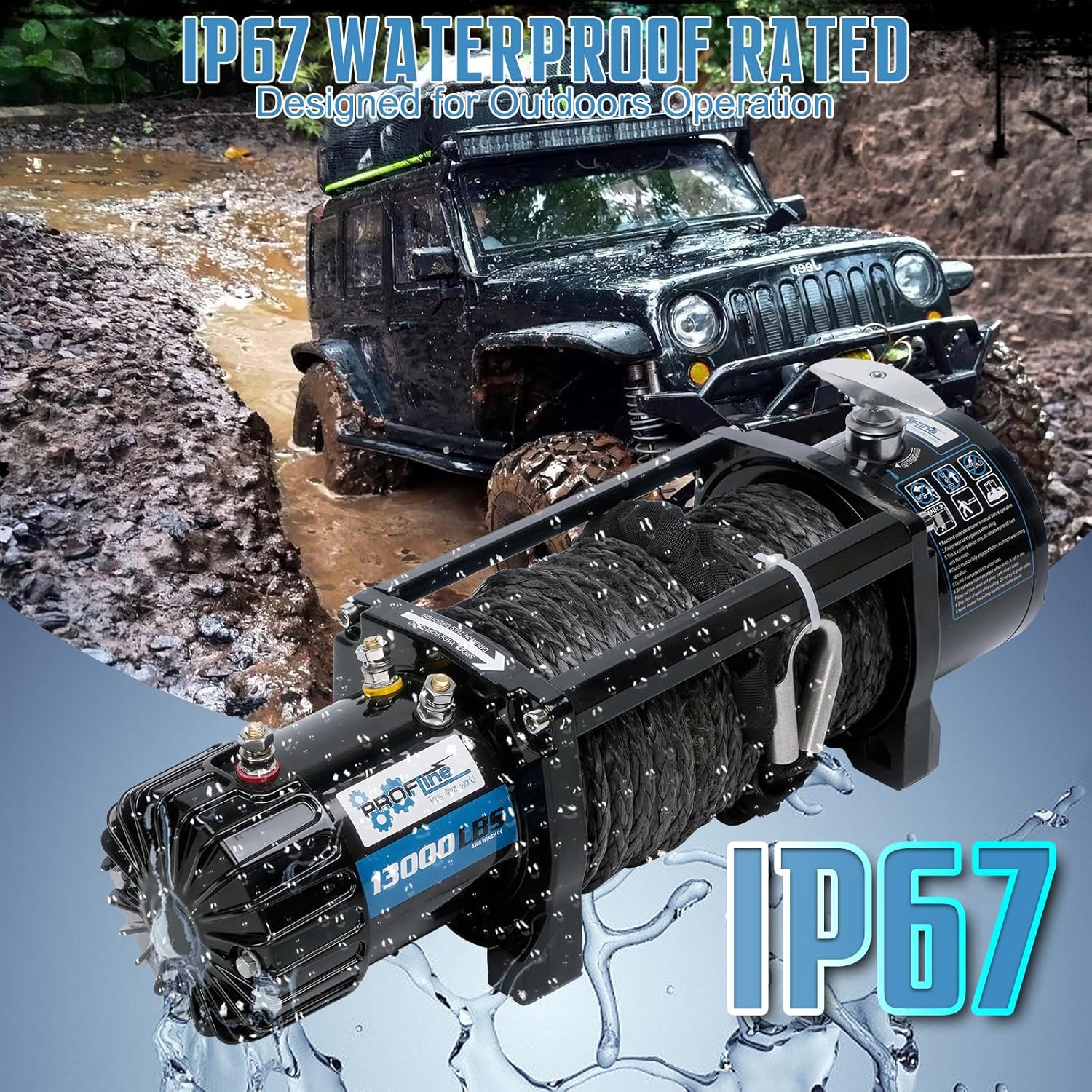 EXCEPTIONAL DESIGN: The synthetic rope winch is additionally provided with a remote control of 100 ft. signal range for your manipulation at a safe distance from the running ATV winch. The traction winch with synthetic rope fits all vehicles quite well and is easy to install with our attached accessories. The IP67 rating and spray paint make the electric ATV winch waterproof and dustproof thus ensuring a long lifetime.