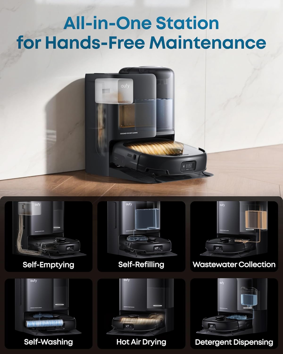 - -- Auto-empties dust into a 3L bag (lasts ~75 days), self-washes roller mops, hot air dries at 50C, and auto-refills water. Complete hands-free convenience for large homes with up to 5 floor plans.