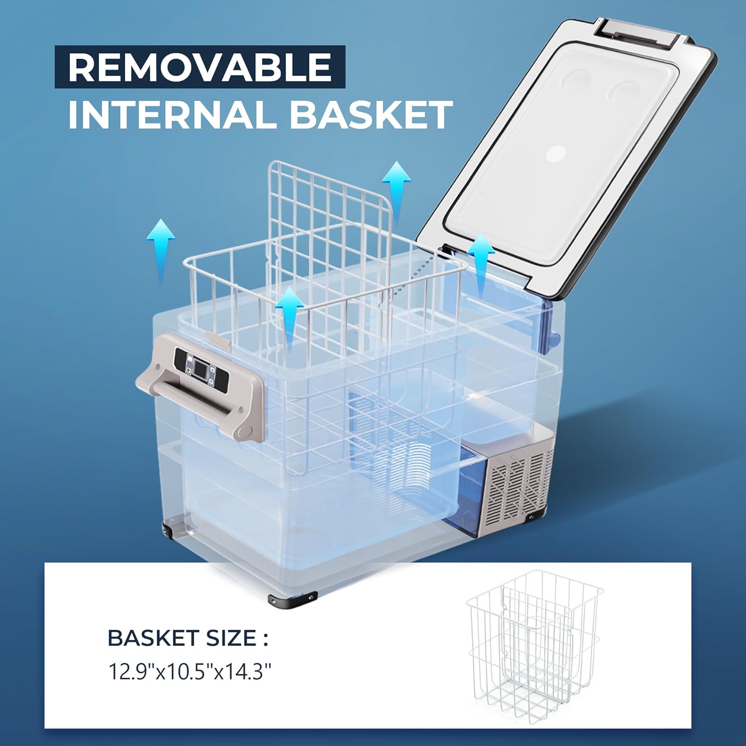 Big Storage & APP Control; The 12v refrigerator is designed with two zones to effectively reduce odor. The 12v cooler features a removable internal basket for easy storage and access. With Bluetooth mode and app control you can conveniently manage the car cooler from a distance to facilitate your journey