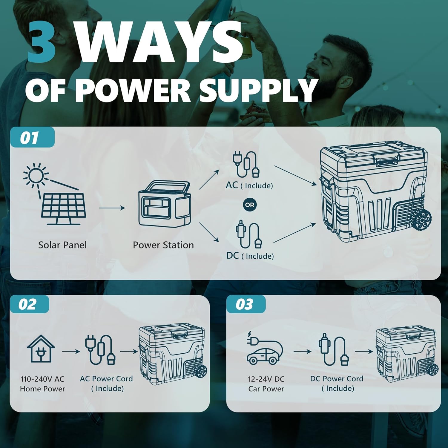 Battery Protection & Multiple Power Supplies; This portable electric cooler offers 3-level battery protection allowing you to adjust the input power between L/M/H modes to prevent overload or vehicle battery drain. The portable fridge can be powered by both DC and AC making it suitable for various scenarios