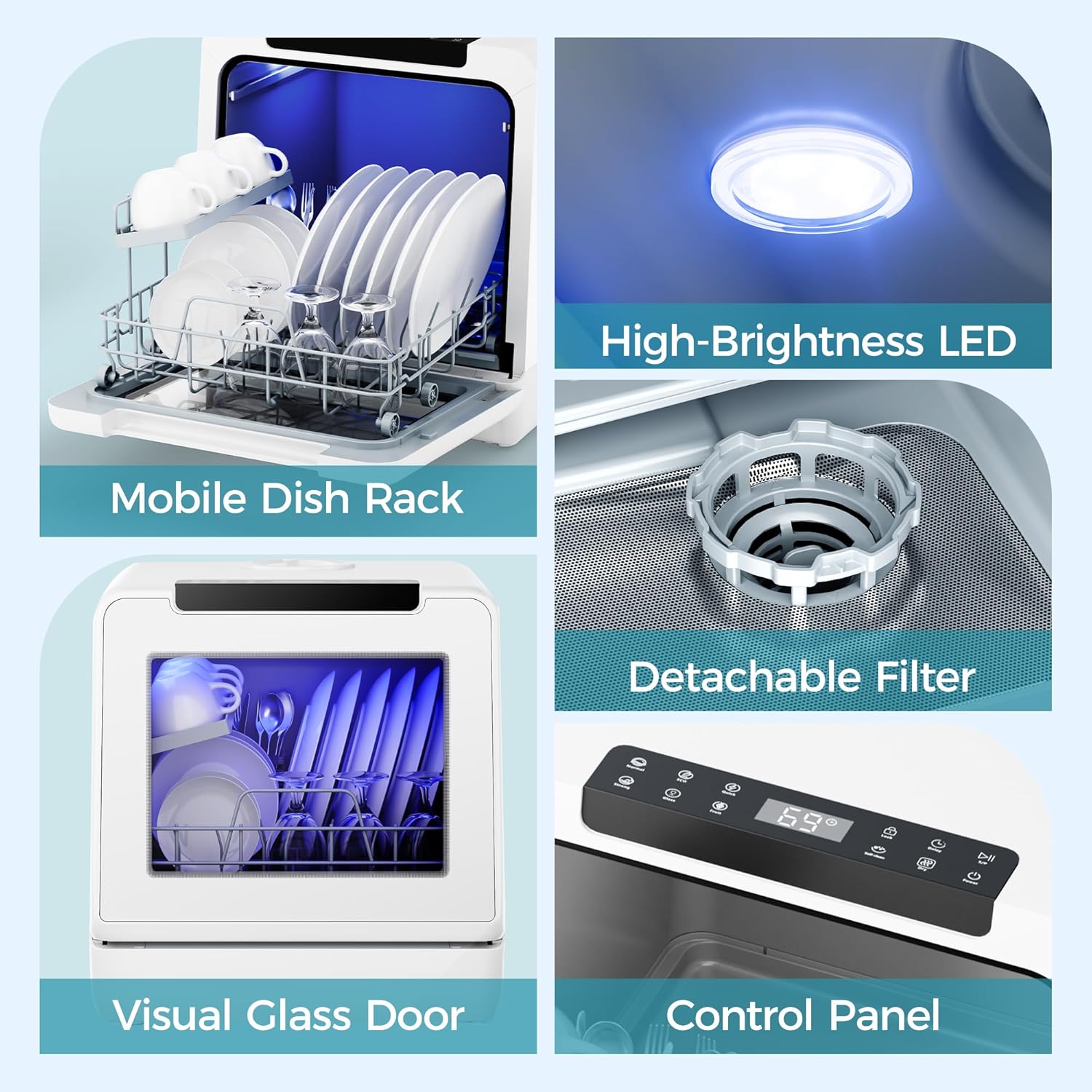 : compact dishwasher offers 8 modes: Normal ECO QUICK (29-min wash) Baby Care/Strong (167F sterilization) Glass Fruit Self-clean and Dry. Dual spray arms provide 360 cleaning tackling greasy dishes baby items or even pet accessories such as pet bowls collars leashes and more. Combines efficiency with deep sanitation. * *Please use the detergent specifically designed for washing dishes