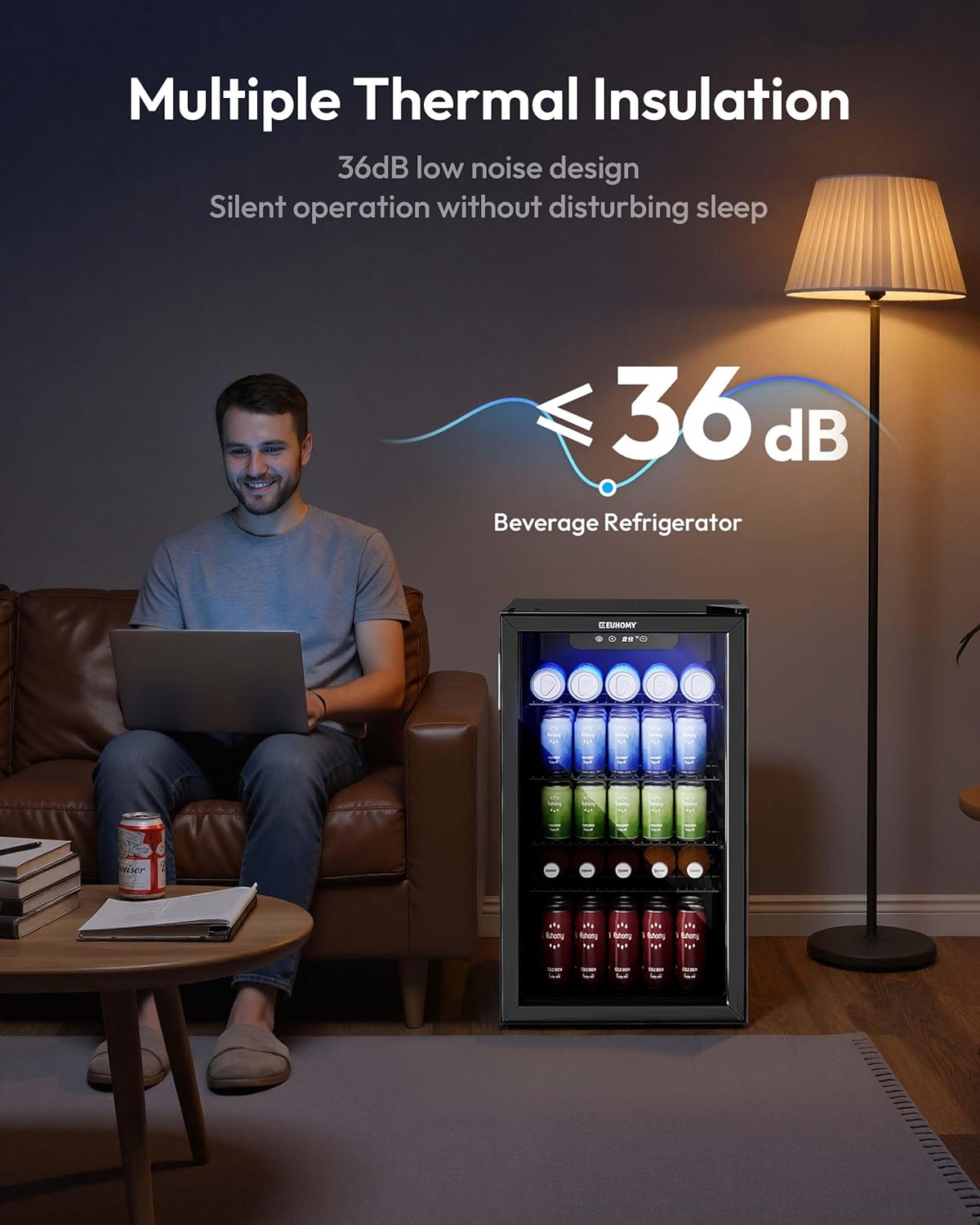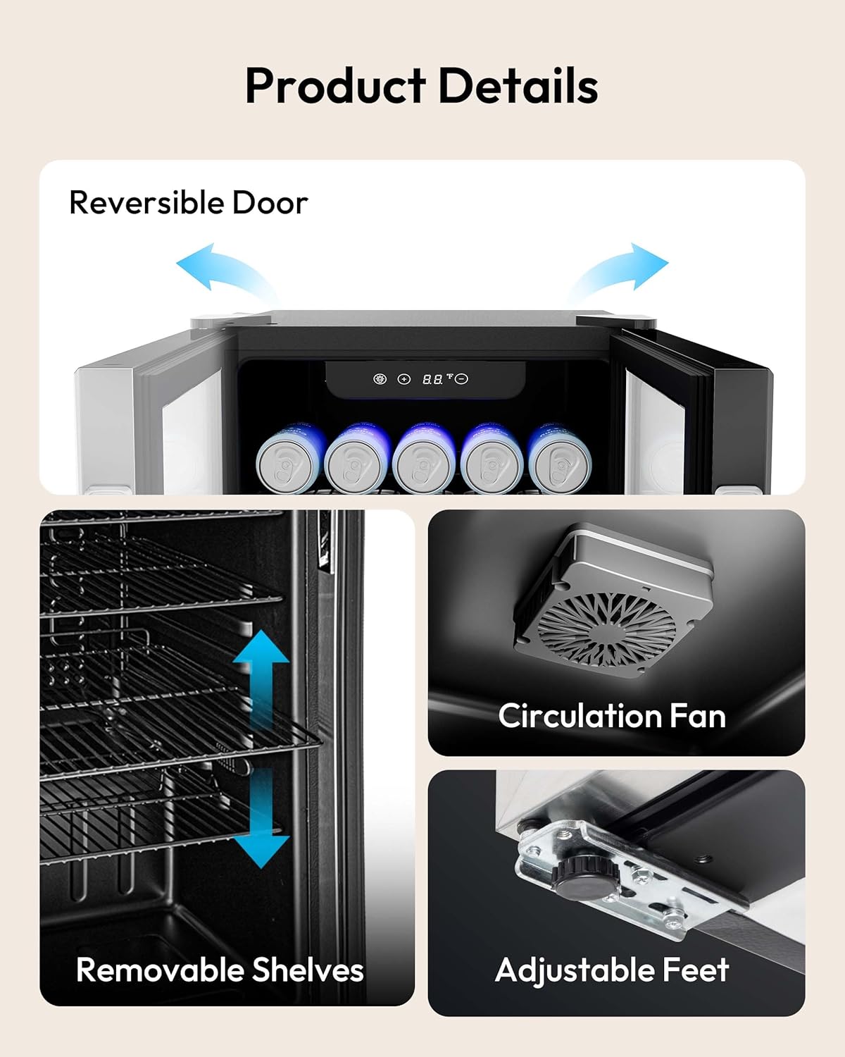 Flexible & Efficient DesignThis mini fridge glass door features a reversible door built in handle and adjustable feet for flexible placement. Energy efficient at just 0.74 kWh per day our beer fridge operates quietly at 36dB making it ideal for freestanding installation in kitchens bedrooms or offices.