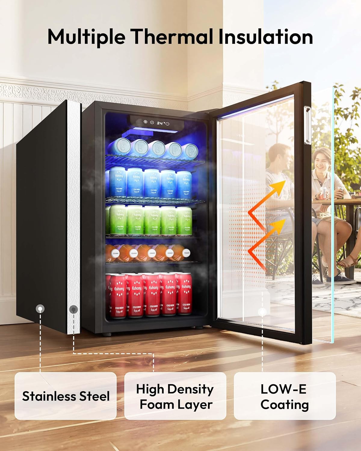 Advanced Cooling & Glass DoorFeaturing a compressor system and air circulation cooling fan for even temperature distribution this beverage fridge maintains a consistent climate. The double layer UV blocking glass door high tightness seal and hight density foam of this mini fridge glass door work together to lock in ideal temperature and humidity protecting your drinks' quality.