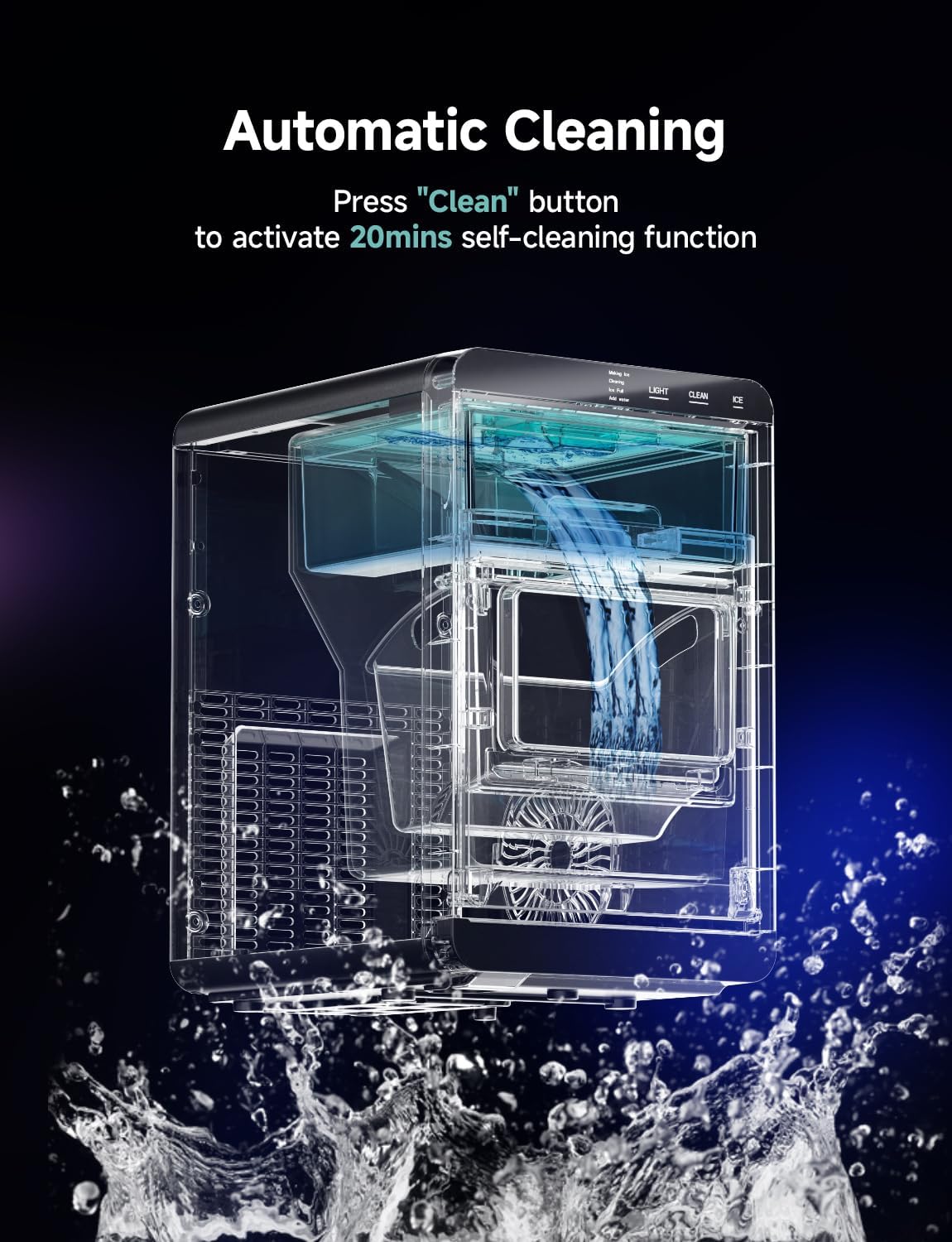 Smart Self-Cleaning System: The pellet ice maker machine countertop features an automated cleaning program. With just one press of the "CLEAN" button enjoy a thorough 20 mins cleaning cycle and no more manual scrubbing required. Maintenance made effortless.