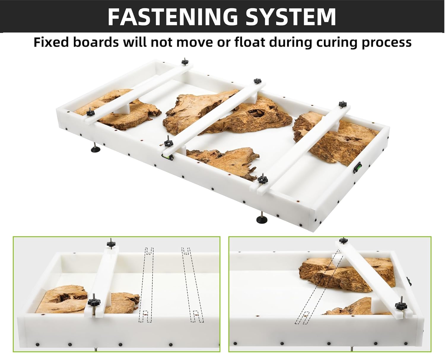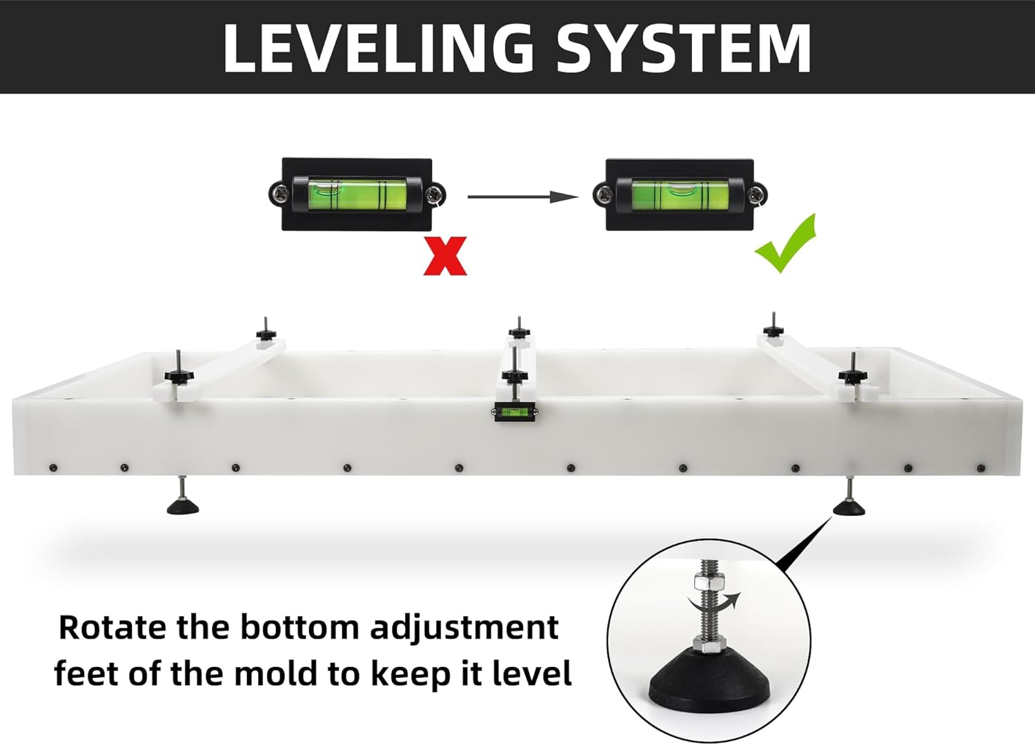 LEVELING AND FASTENING SYSTEM - This resin mold features 2 levels and 4 adjustable feets for real-time level monitoring and adjustment 3 adjustable pressure bars and 6 clamping blocks to easily secure the wood blank without the need for additional fixing tools. Whether you are making cutting boards trays river tables or coffee tables our resin table molds can help you better complete various projects.