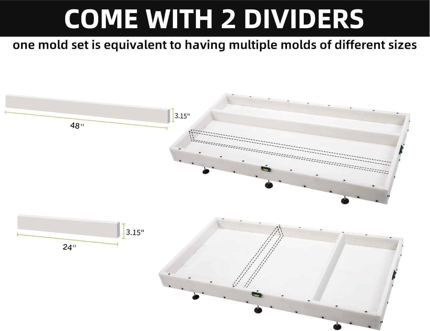 ADJUSTABLE SIZE - The set includes 2 free 48x3.15 and 24x3.15 inch dividers. By adjusting the position of the dividers our epoxy resin molds can flexibly separate into multiple sizes making one set of molds equivalent to having multiple molds of different sizes. This design gives our molds excellent adaptability and versatility allowing them to meet various size requirements.