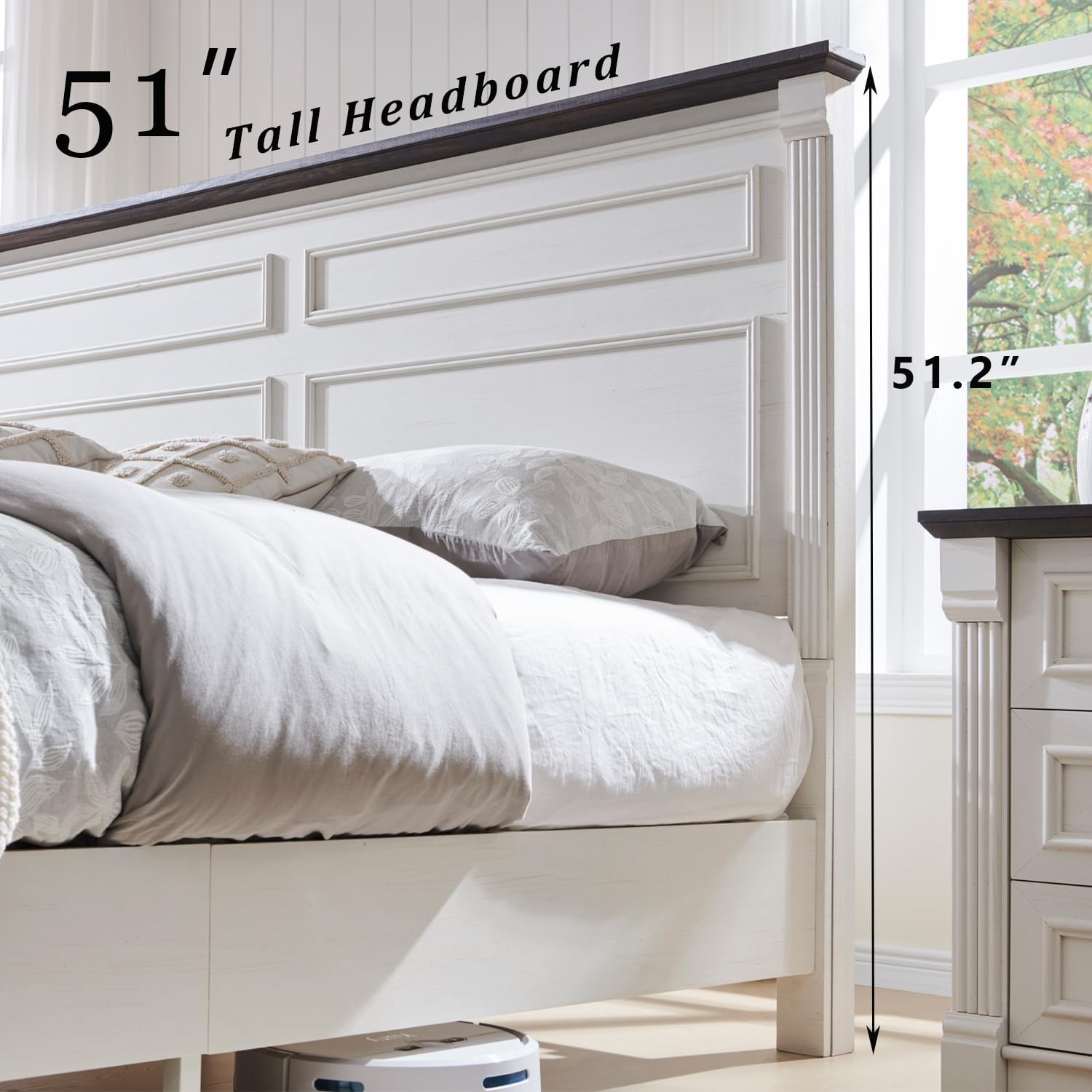 MAXIMIZE STORAGE SPACE: The chic Wood Platform Bed Frame blends farmhouse beauty with the practicality of storage space. Featuring elegant Roman post accents on the footboard, this farmhouse style bed frame adds both storage and a touch of timeless charm to your bedroom. With three Large Drawers in the footboard, this farmhouse-style bed with storage frame maximizes storage space and is perfect for storing bedding, clothing and other essentials, reducing dust when storing items