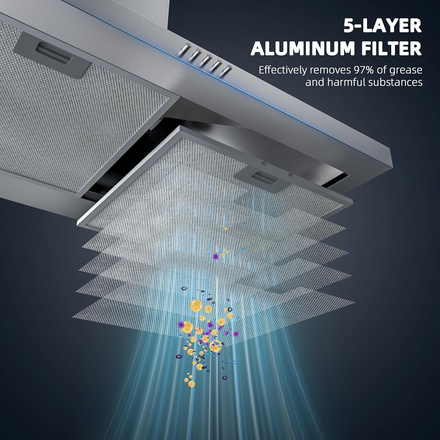 The 30 inch range hood is made of brushed stainless steel which is corrosion rust and high temperature resistant. The range hood has a smooth surface that is easy to clean and wipe. Multi-layer aluminum filters can be clean by hand and dishwasher.
