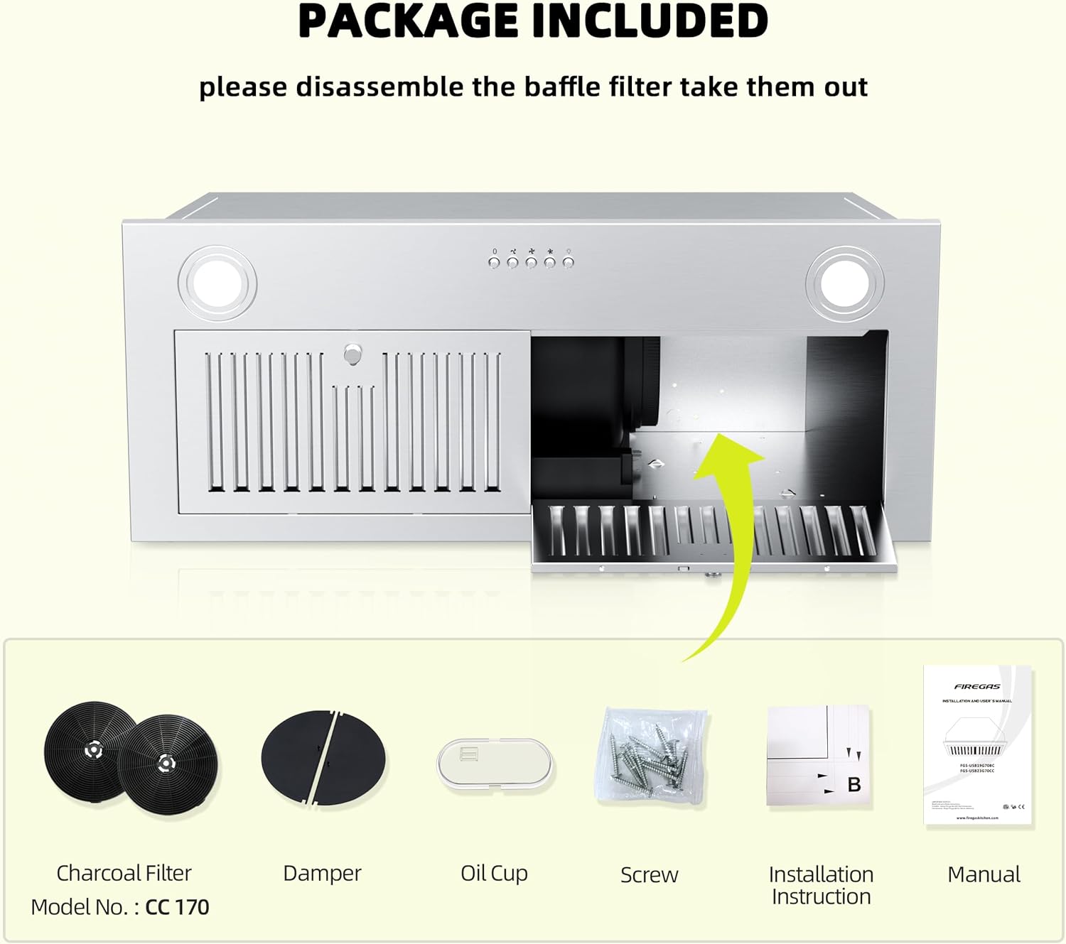 EASY TO INSTALL AND OPERATION: Easy to install with the instruction manual and the installation guide video.Built in range hood are easy to turn on and off Low/ Medium/ High Speed button suitable for different cooking method.Keeping the kitchen cleaner and fresher with kitchen range hood.