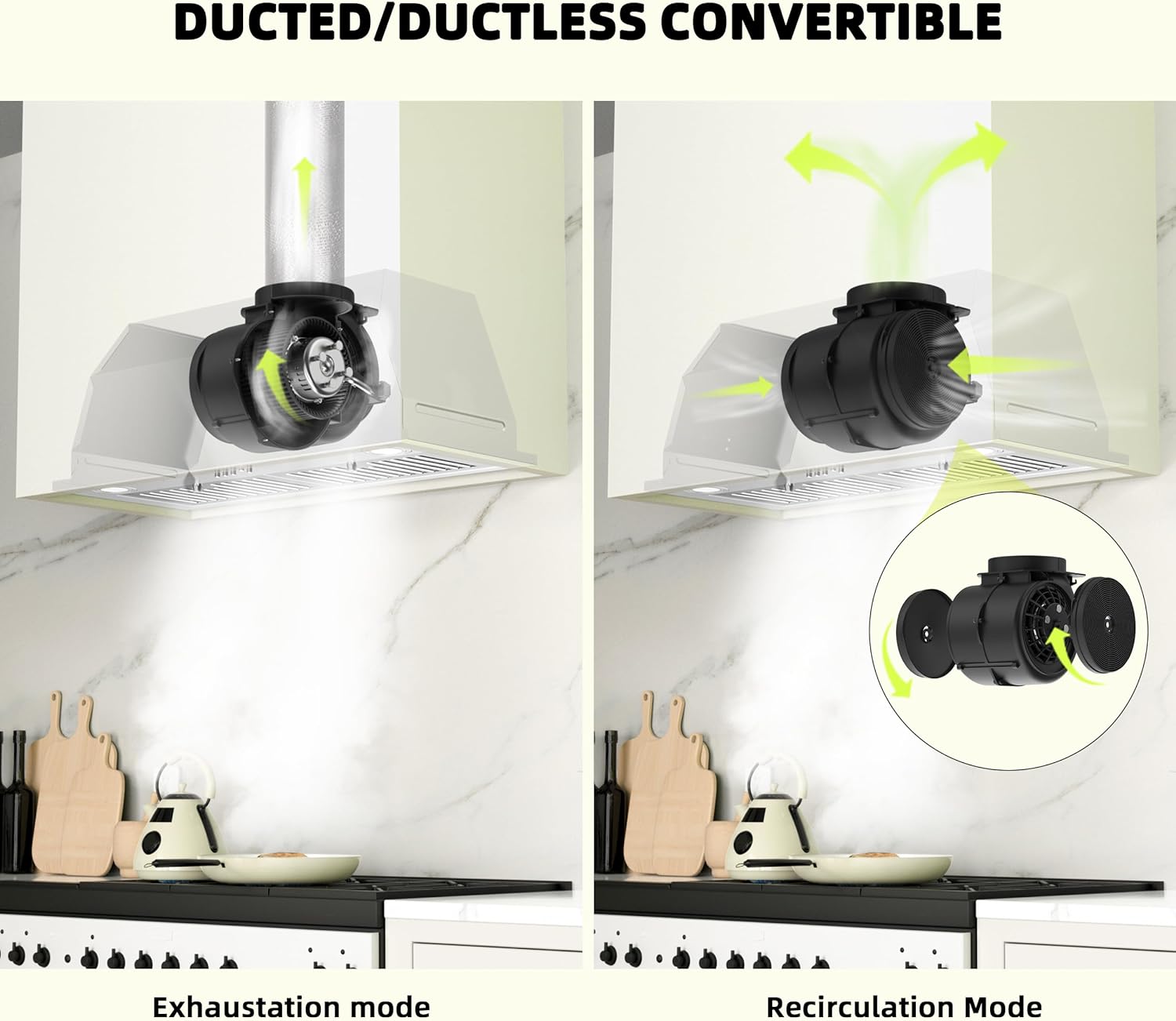 POWERFUL BUT REALLY QUIET RANGE HOODS: Exhaust hoods fits 6 inch round duct which is capable of vent-less or recirculation operation great for ductless kitchen.Ultra quiet operation noise of 30 inch vent hood less than 57dB at high speed.The range hood insert with 2pcs LED lamps would illuminate your kitchen workspace with warm and attractive lamps.