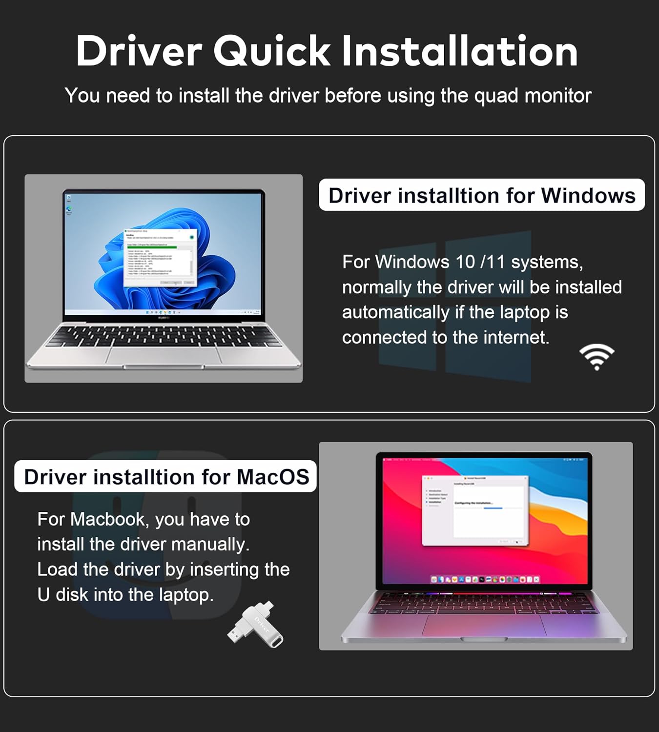 Seamless Connectivity: With Just 1 Cable for 3 Screens our laptop screen extender is compatible with Windows (Win10 and later) and macOS (2019 or later Macbooks including M1 M2 M3 chipsets) for laptops ranging from 13.6" to 17.3". (Please note: Not applicable to Microsoft Surface series and Chormebook). Whether you choose a USB-C or USB-A connection(Support: Thunderbolt 3/4/ USB-C/ USB-A) it's easy to connect with just 1 cable. (Please connect PD power supply when you use the quad monitor.)