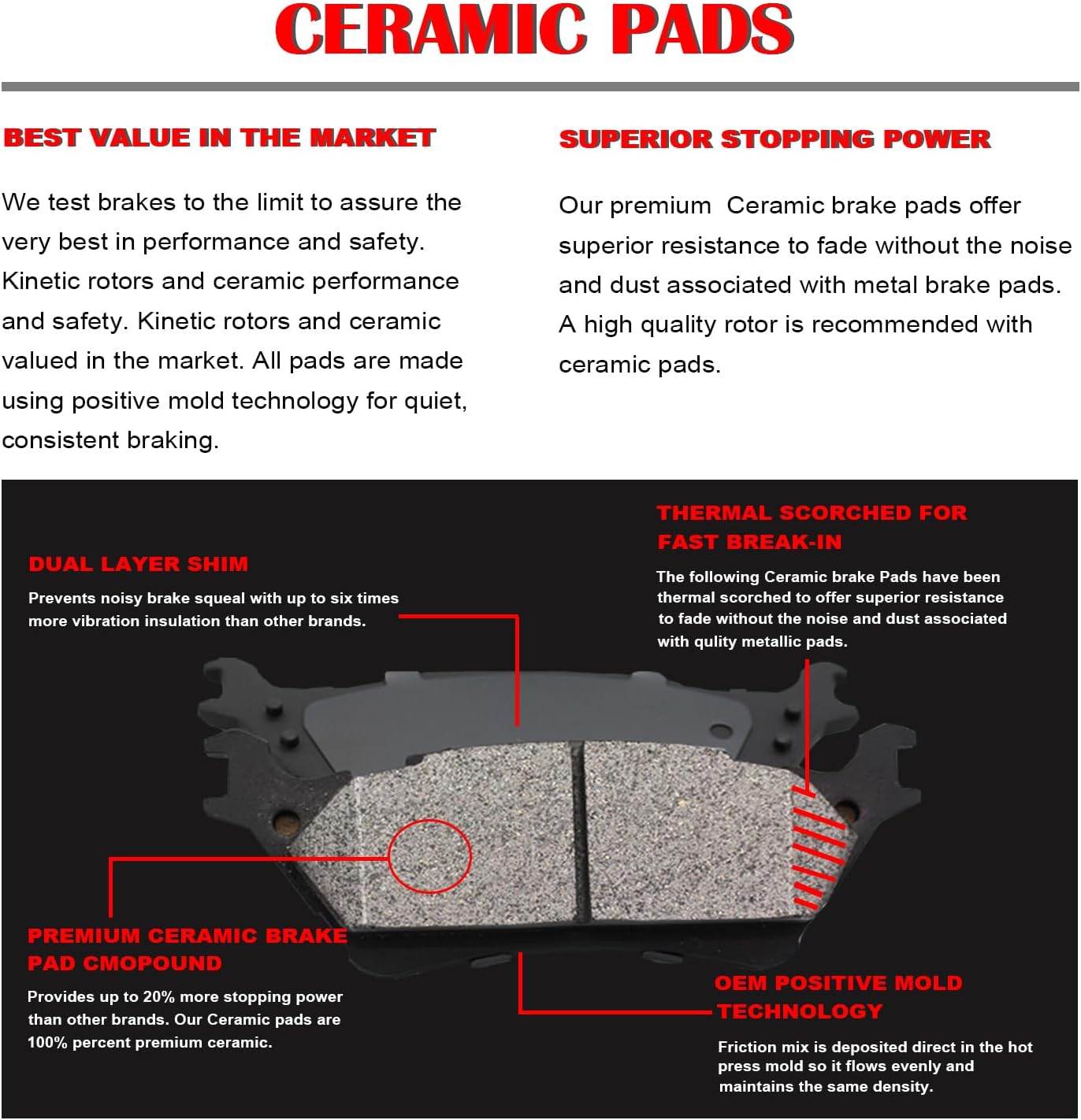 Ceramic Formula: The brake pads use ceramic formula which is clean and no noise during braking