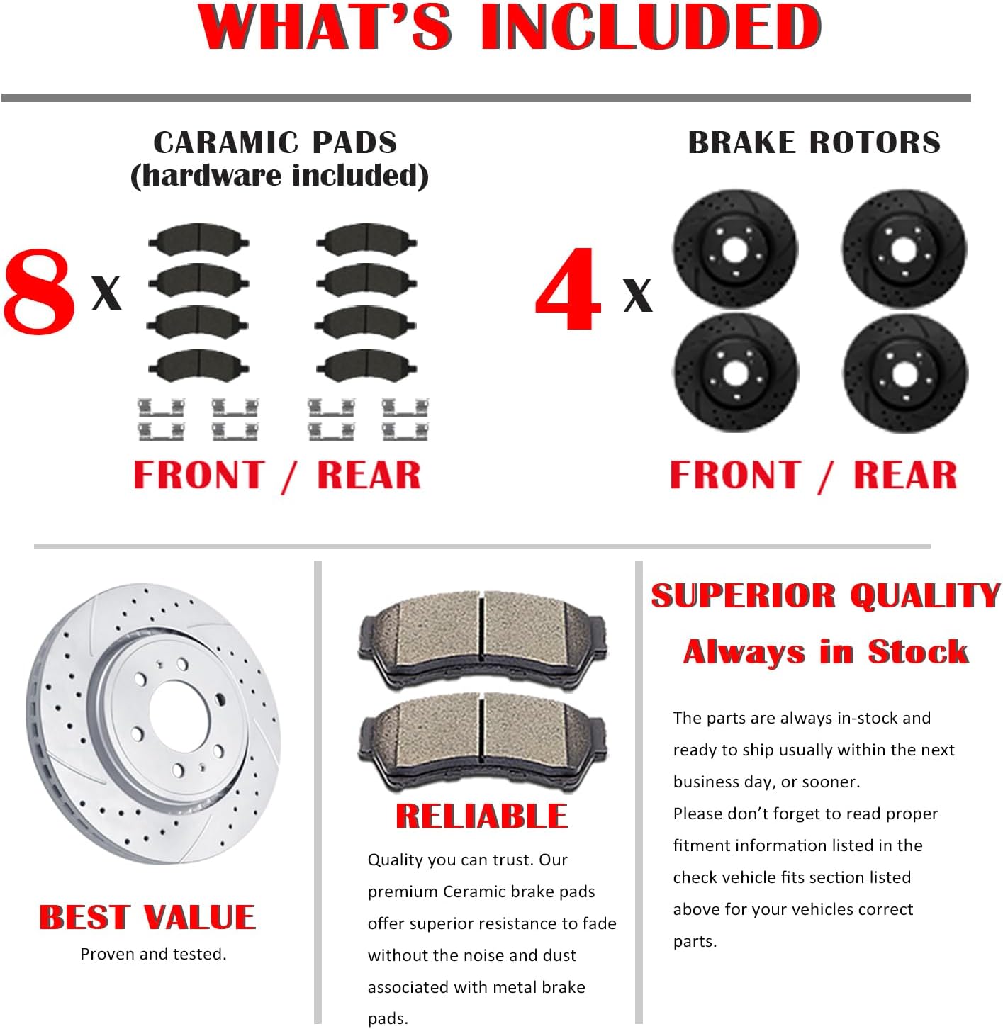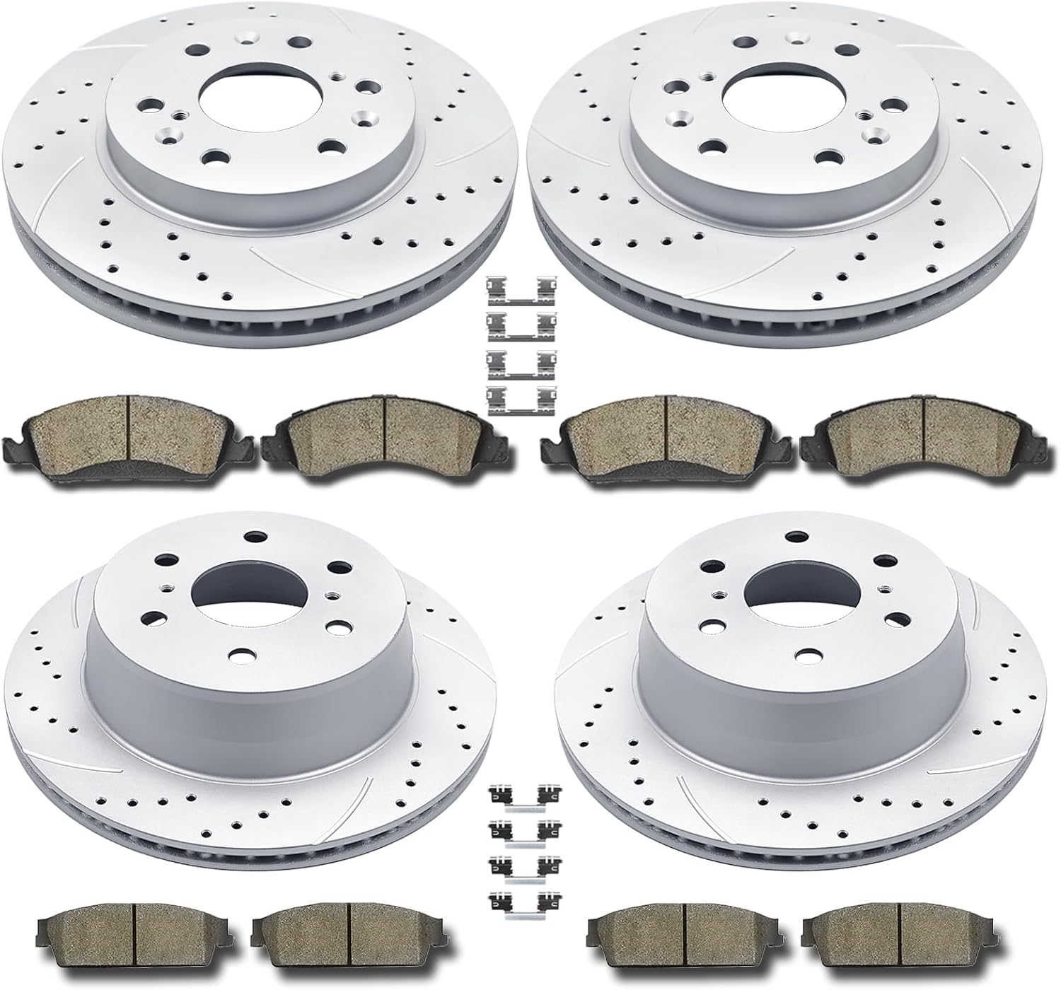 Includes: 2x Front Drilled & Slotted Disc Brake RotorsDiameter 12.99 inch 330mm- 55097; 4x Front Ceramic Brake Pads (Hardware Included) - D1363; 2x Rear Drilled & Slotted Disc Brake RotorsDiameter 13.58 inch 345mm- 55133; 4x Rear Ceramic Brake Pads (Hardware Included) - D1194;