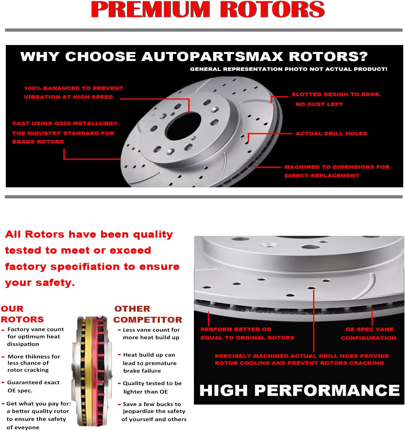 Performance Improvement: The brake discs rotors use drilling and slotting technology which can not only enhance the dust exhaust function but also improve the heat dissipation performance and keep stable in braking