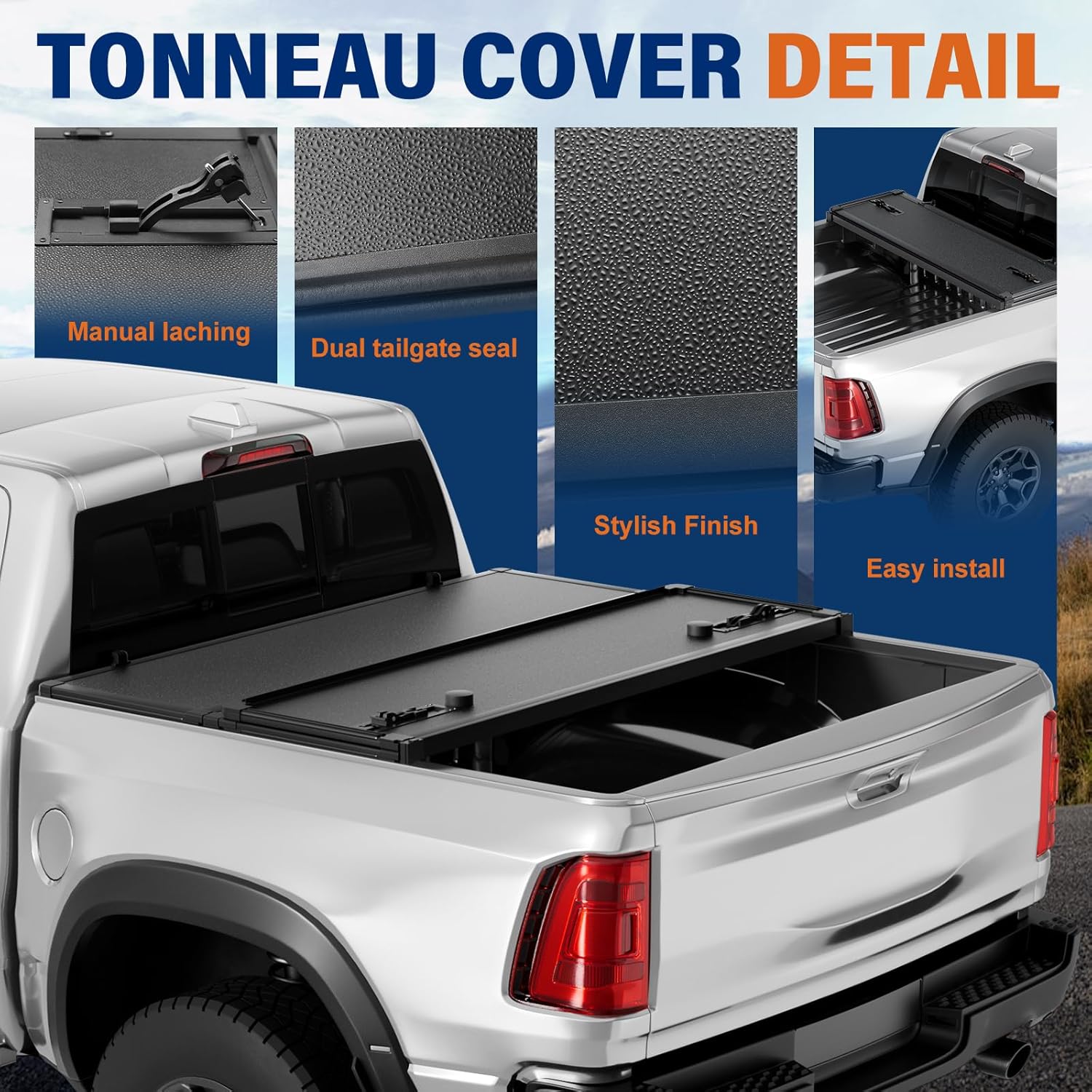 All-around Strength - Built with high-grade FRP and aluminum panels and internal honeycomb structure support this hard fold tonneau cover can support up to 400 lbs offering excellent protection and added security against theft and damage.
