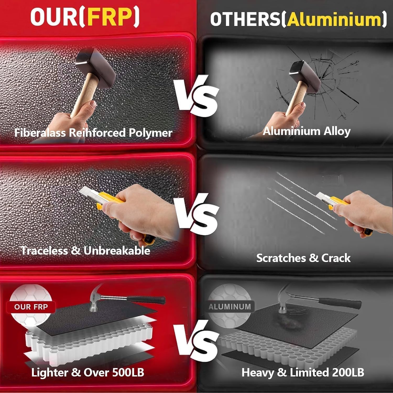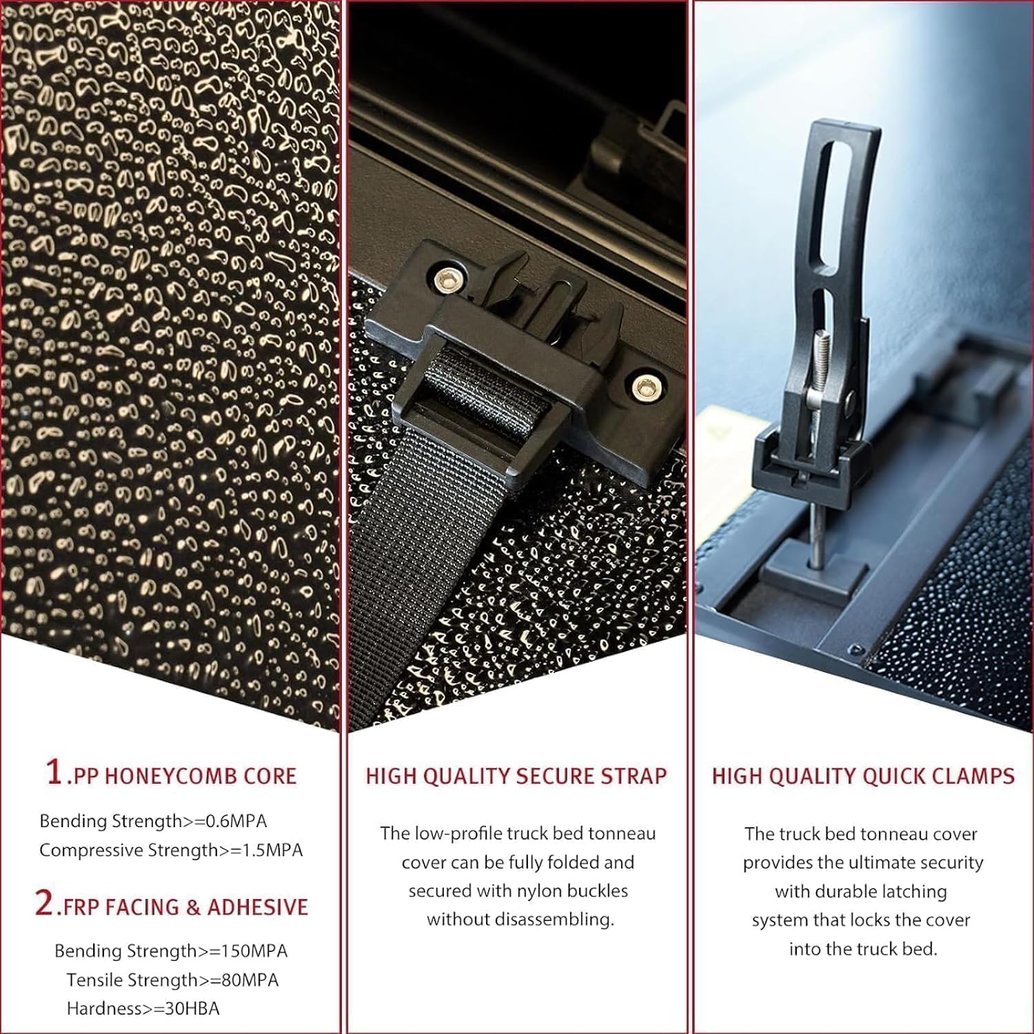 HIGH STRENGTH MATERALS: The hard folding 2016-2026 Toyota Tacoma Tonneau cover is 100% brand new and made of PP Honeycomb and FRP Facing Hardness of FRP 30HBa Compressive Strength 1.5MPa which is more scratch resistant and stronger than aluminum alloy.