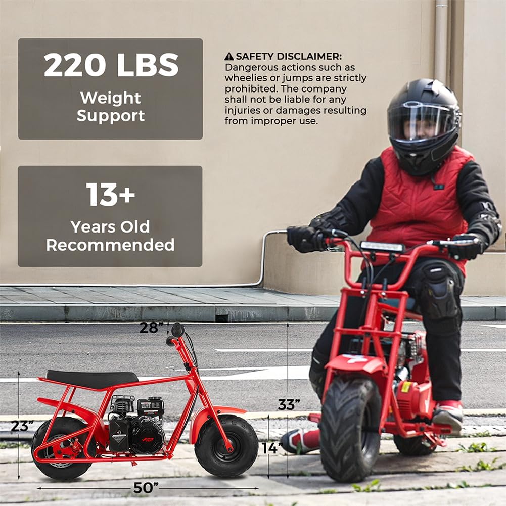 NO OIL MIXING NEEDED: The 99 cc 4 stroke gas mini bike offers enhanced power No oil gas mixing required It reaches speeds up to 28 MPH supports up to 220 lbs and provides a 30 mile range on just 0.36 gallons of gas.Exclusively requires 15W-40 high-viscosity oil for optimal performance under heavy loads and high temperatures.