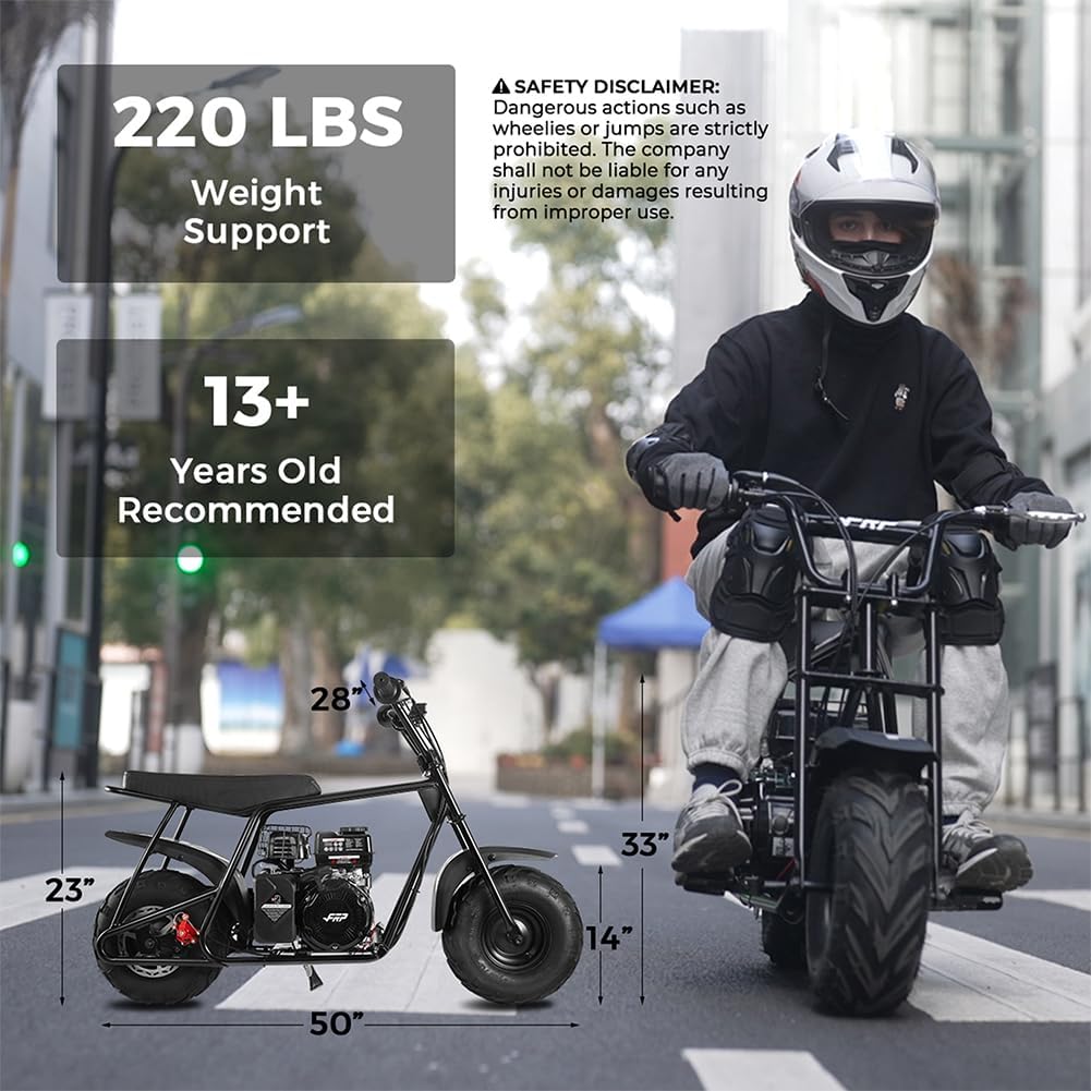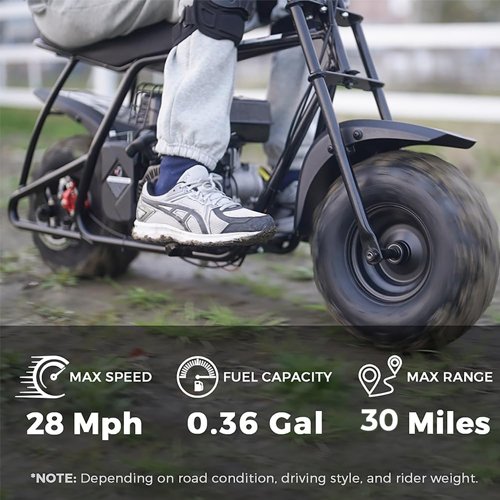 NO OIL MIXING NEEDED: The 99 cc 4 stroke gas mini bike offers enhanced power No oil gas mixing required It reaches speeds up to 28 MPH supports up to 220 lbs and provides a 30 mile range on just 0.36 gallons of gas.Exclusively requires 15W-40 high-viscosity oil for optimal performance under heavy loads and high temperatures.
