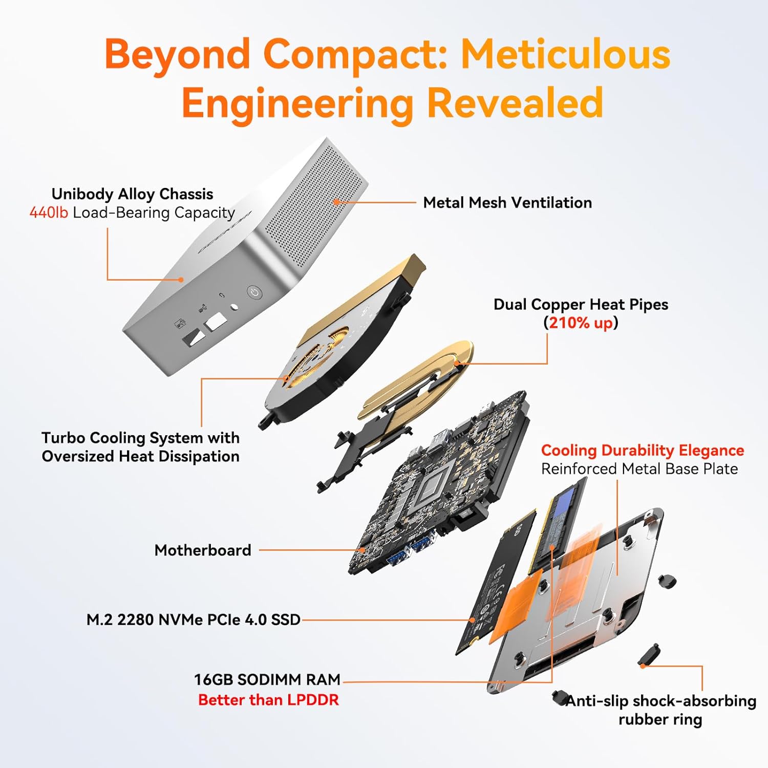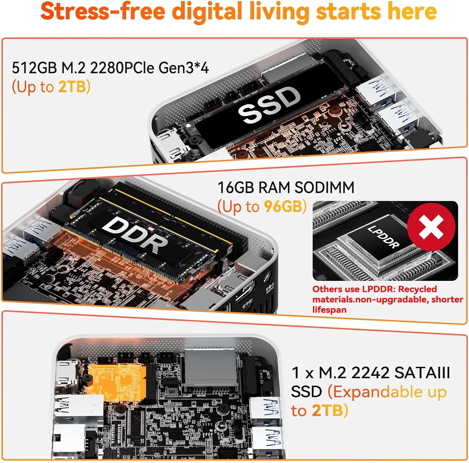 [- & ] The A5 Pro features 16GB dual-channel DDR4 and supports upgrades up to 96GB for heavier multitasking and demanding workloads. Unlike soldered memory you can expand as your needs grow. Storage is just as flexible: 512GB PCIe NVMe SSD (upgradeable up to 2TB) plus a second M.2 slot and a 2.5" SATA bayup to 2TB each. Need even more space? Add high-speed external drives via USB 3.2 for bigger projects faster workflows and a larger game/media library.