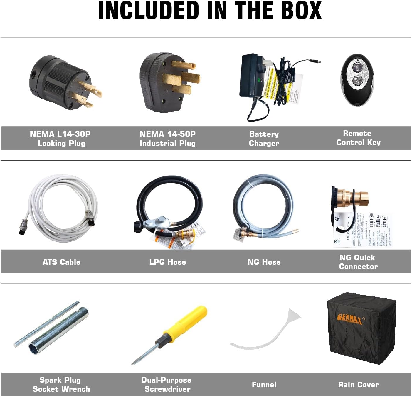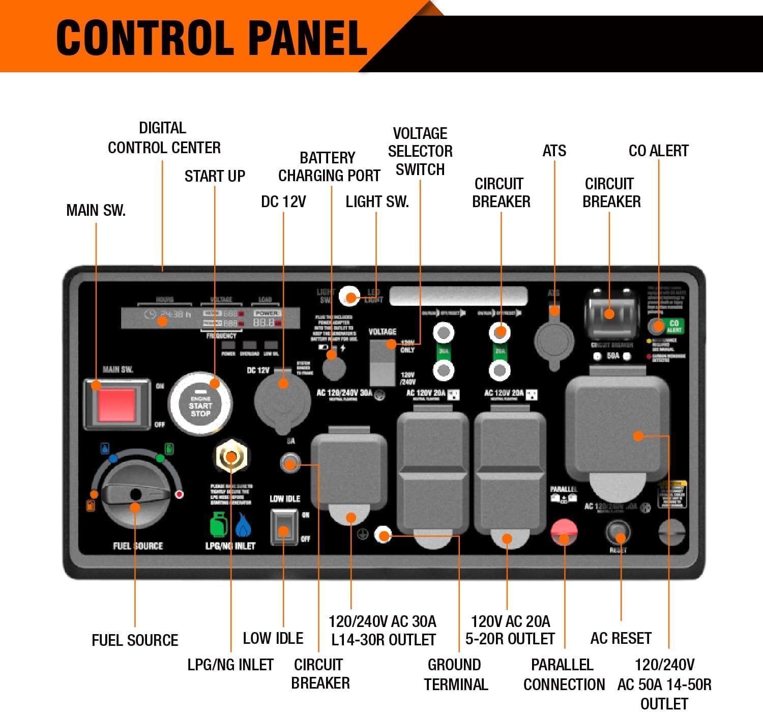 Diversified functional control Panel Easy operation panel with remote start one-button start/electric start /ATS automatic control etc. diversified configuration: equipped with 1X 120/240V AC 30A L14-30R Outlet DC Cigarette Lighter Outlet: 12V DC 8.3A 1X 120/240V AC 50A 14-50R Outlet 4X120V AC 20A 5-20R Outlet CO Alarm Parallel Connectors Battery Charging Port overload reset switch and LED Light Voltage transfer Switch can meet 120V/240V simultaneous use
