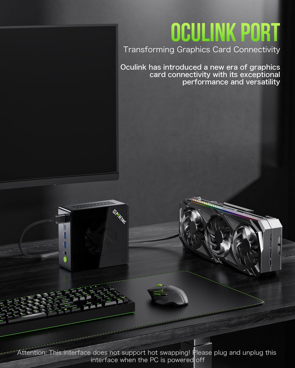 Oculink Port The M7 Oculink port enables higher bandwidth capabilities better frame rates and lower lag. The standard also operates at PCIe x4 speeds compared to Thunderbolt's x3. Gamers and content creators can benefit from OCuLink's higher bandwidth resulting in better performance and lower lag for eGPU setups