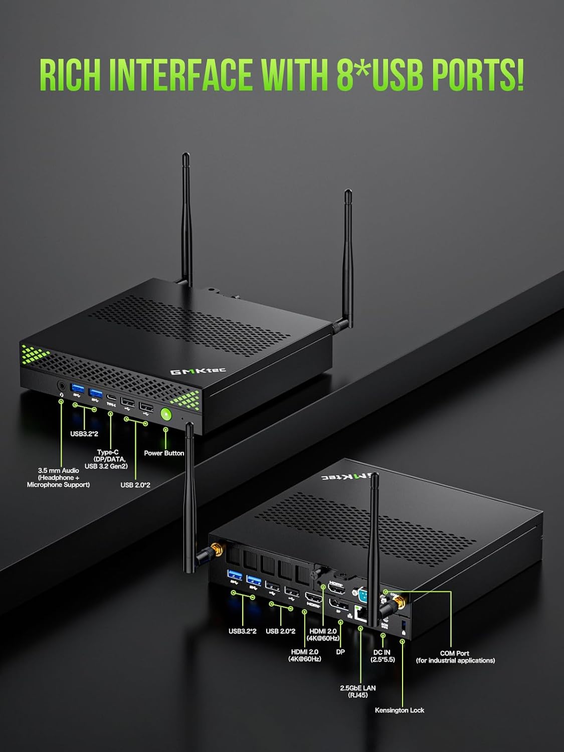 VERSATILE I/O CONNECTIVITY - K10 Mini PC offers a wide array of ports to meet diverse needs including 4USB 2.0 ports (480 Mbps) 4USB 3.2 ports (10 Gbps) 2HDMI 2.0 (4K @ 60Hz) 1DisplayPort 1.4 (8K @ 60Hz) 13.5mm audio jack (headphone + microphone) 1COM port for industrial and embedded system applications 1Type-C (DP/Data USB 3.2 Gen2 no PD power) 12.5G Ethernet RJ45 port and 1 DC IN (2.5*5.5mm) offering flexibility for various devices and peripherals