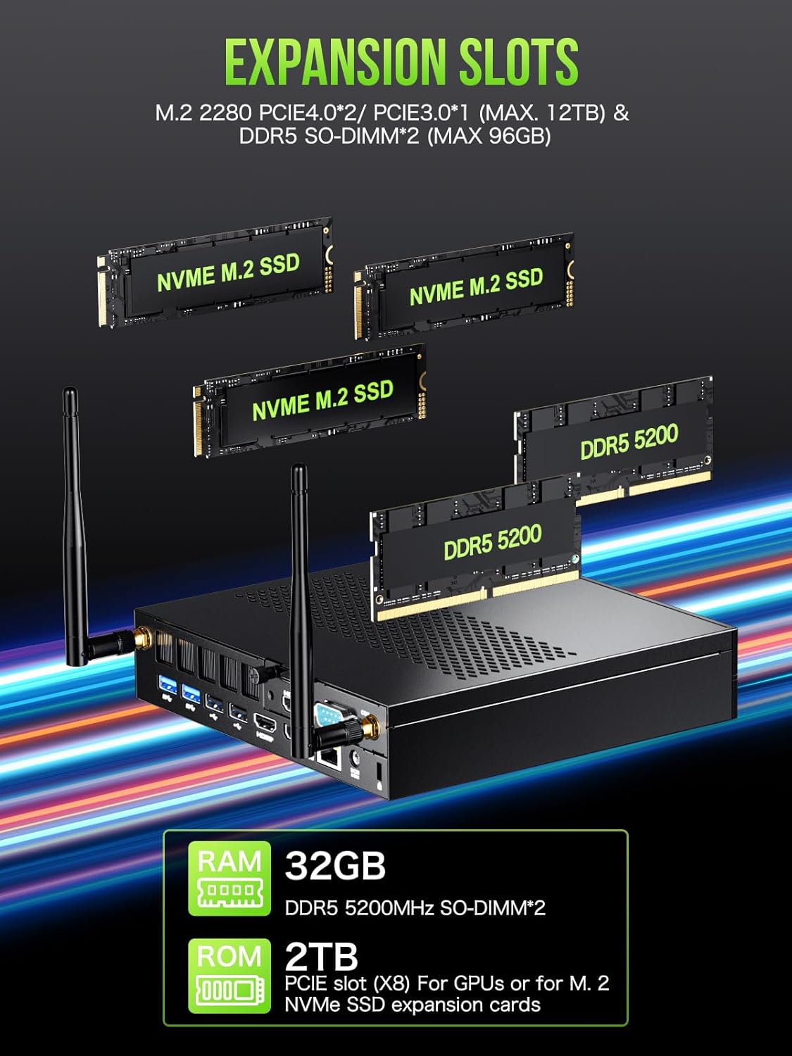 32GB DDR5 RAM & 1TB STORAGE - With 32GB of DDR5 5600 MHz dual-channel RAM (CPU supports up to 5200MHz) and a 1TB PCIe X4 NVMe M.2 2280 SSD K10 mini PC provides fast and efficient memory handling. It supports up to 3x M.2 2280 PCIE slots and up to 12TB of storage with expansion (3 *4TB) ensuring plenty of room for all your data needs