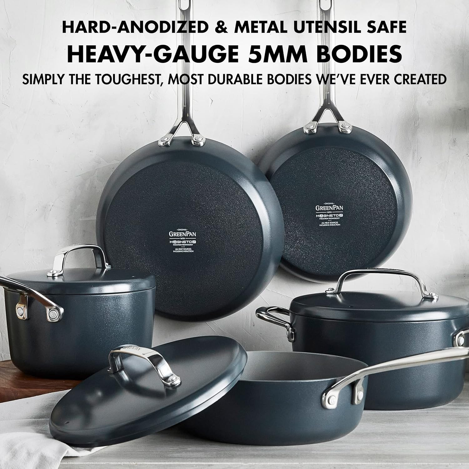 HEAVY-GAUGE ARMHkcvvHkcvv BOHkcvvIES: These 5mm hard anodized pans are metal utensil safe and deliver remarkable strength with next-level scratch resistance.