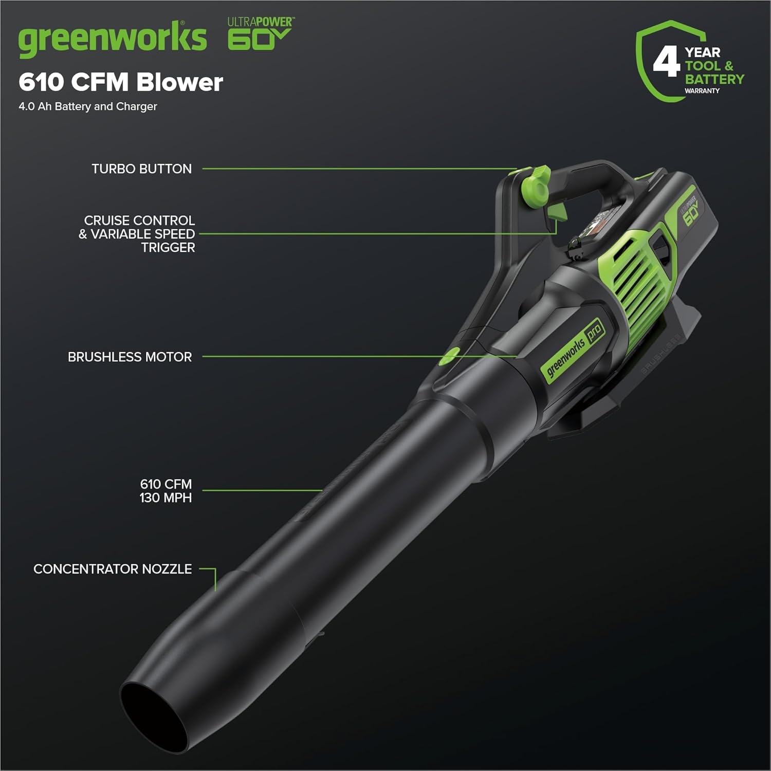 60V LEAF BLOWER: Provides powerful clearing performance featuring 610 CFM air flow and 130 MPH air speed. Variable speed trigger with cruise control provides controlled airflow when its needed most
