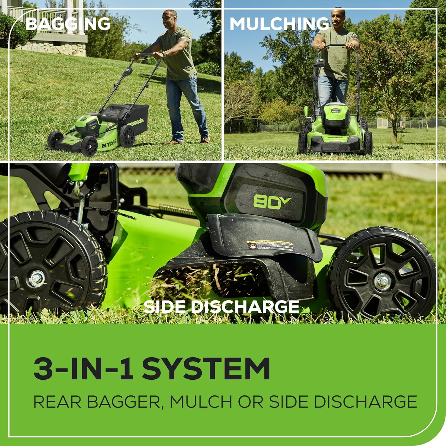 Versatile 3-in-1 System: Equipped with a 21-inch steel deck this kit offers a 3-in-1 system for mulching rear bagging and side discharge providing flexibility to suit your lawn care preferences.