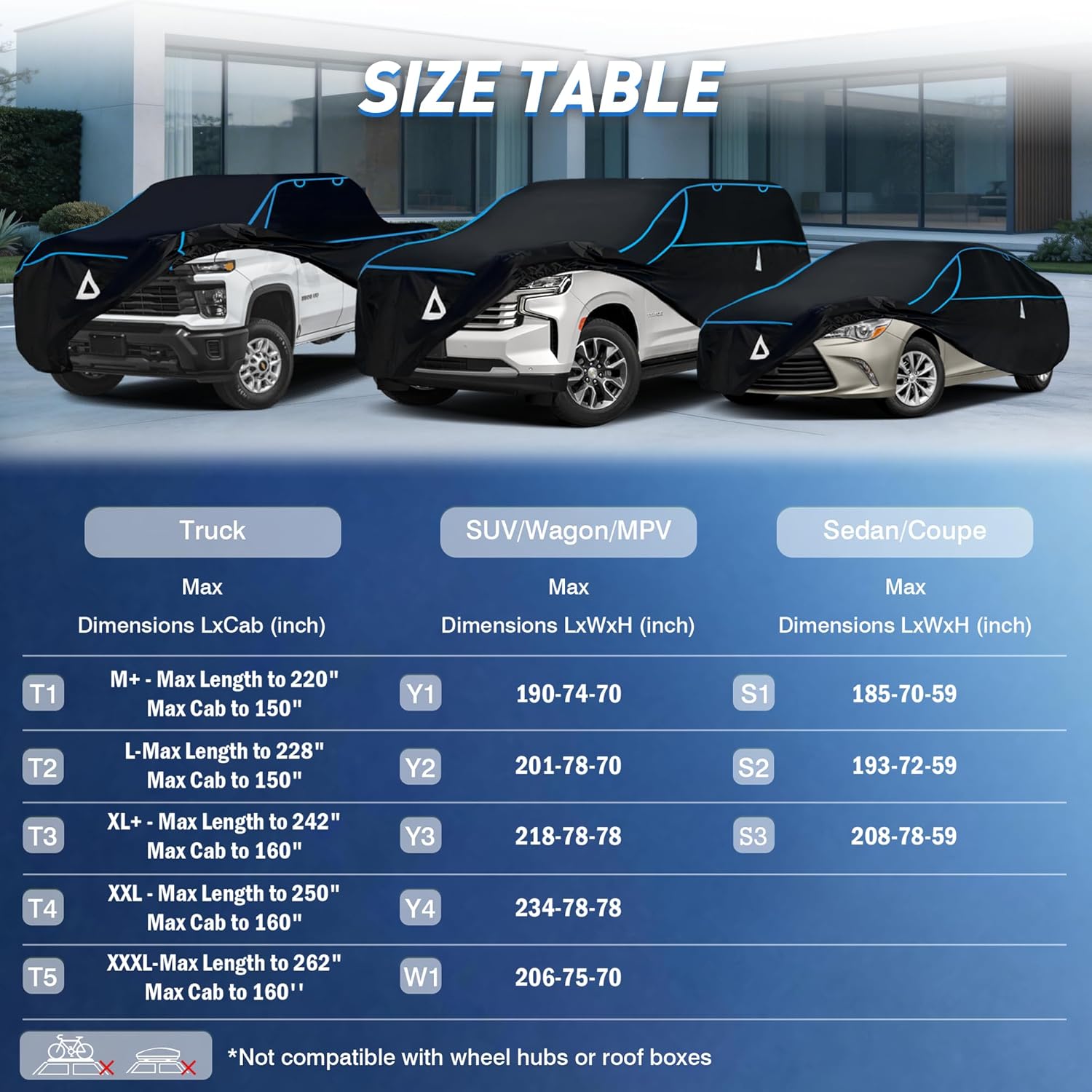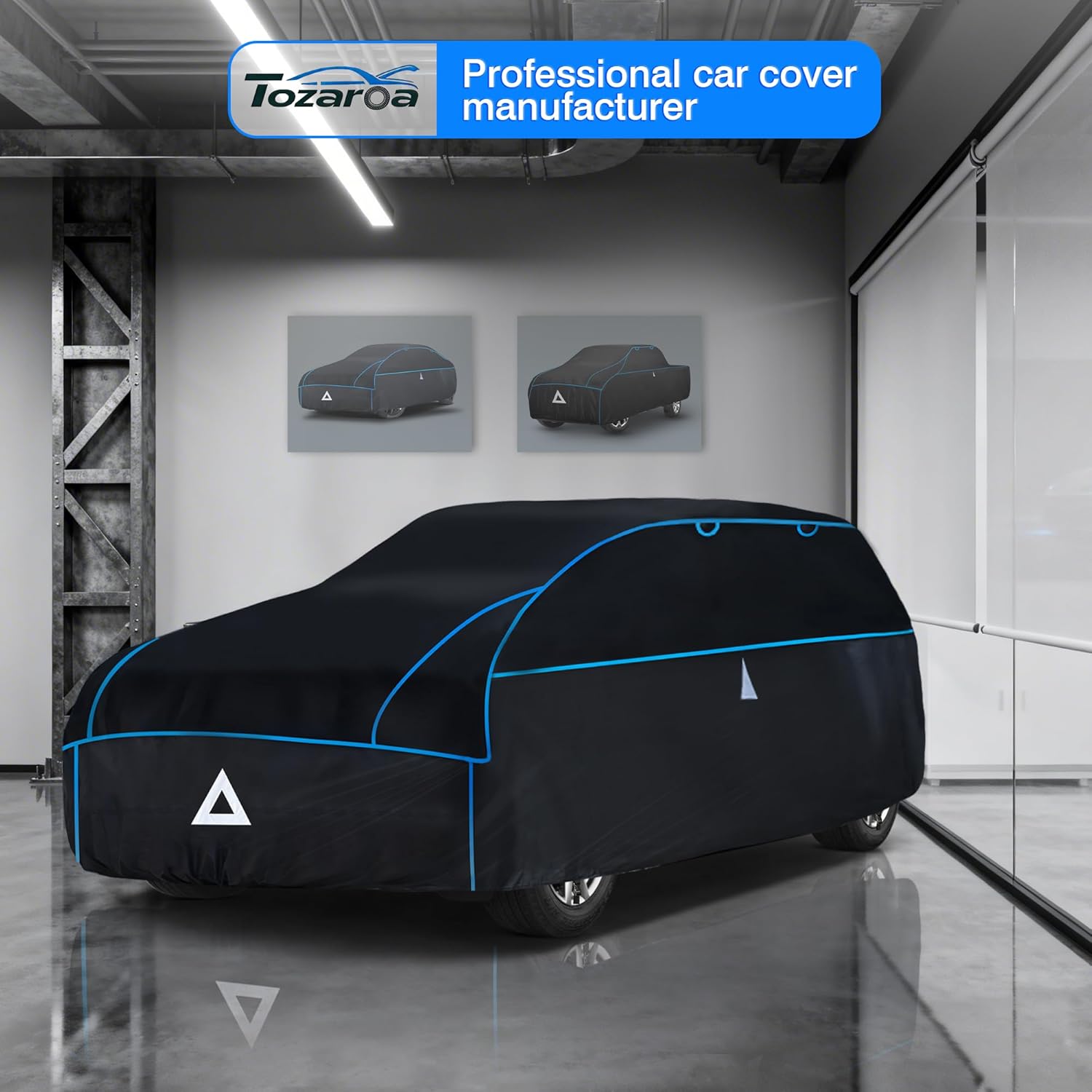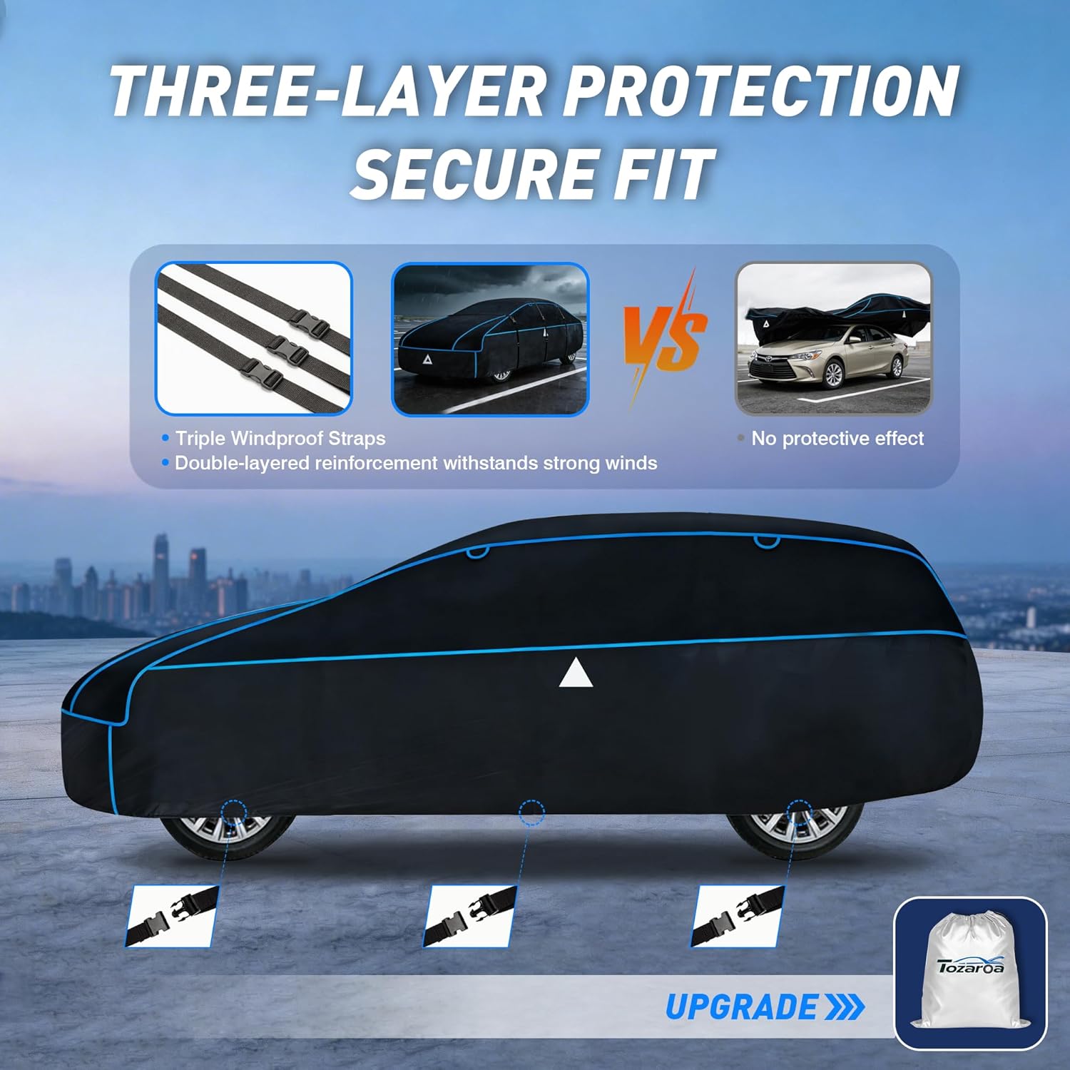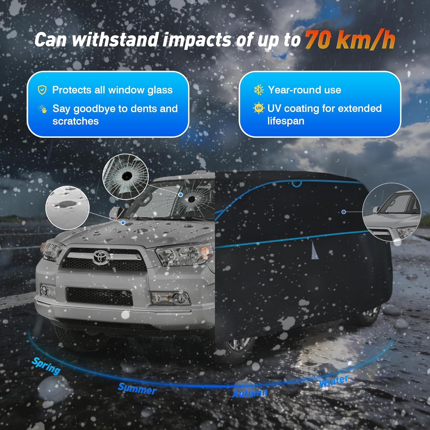 Optimized Design: 1.Hailproof Tech: Advanced multi-layer EVA composite shields your car from heavy hail damage.2.360 Visibility: All-side reflective strips boost night safety and prevent low-light accidents.3.Custom Fit: Elastic bottom hem ensures a snug secure wrap for maximum vehicle coverage.4.Breathable Design: Dual side vents with protective covers reduce moisture and promote airflow.5.Stormproof: 3 heavy-duty bottom straps keep the cover locked down even in high winds.