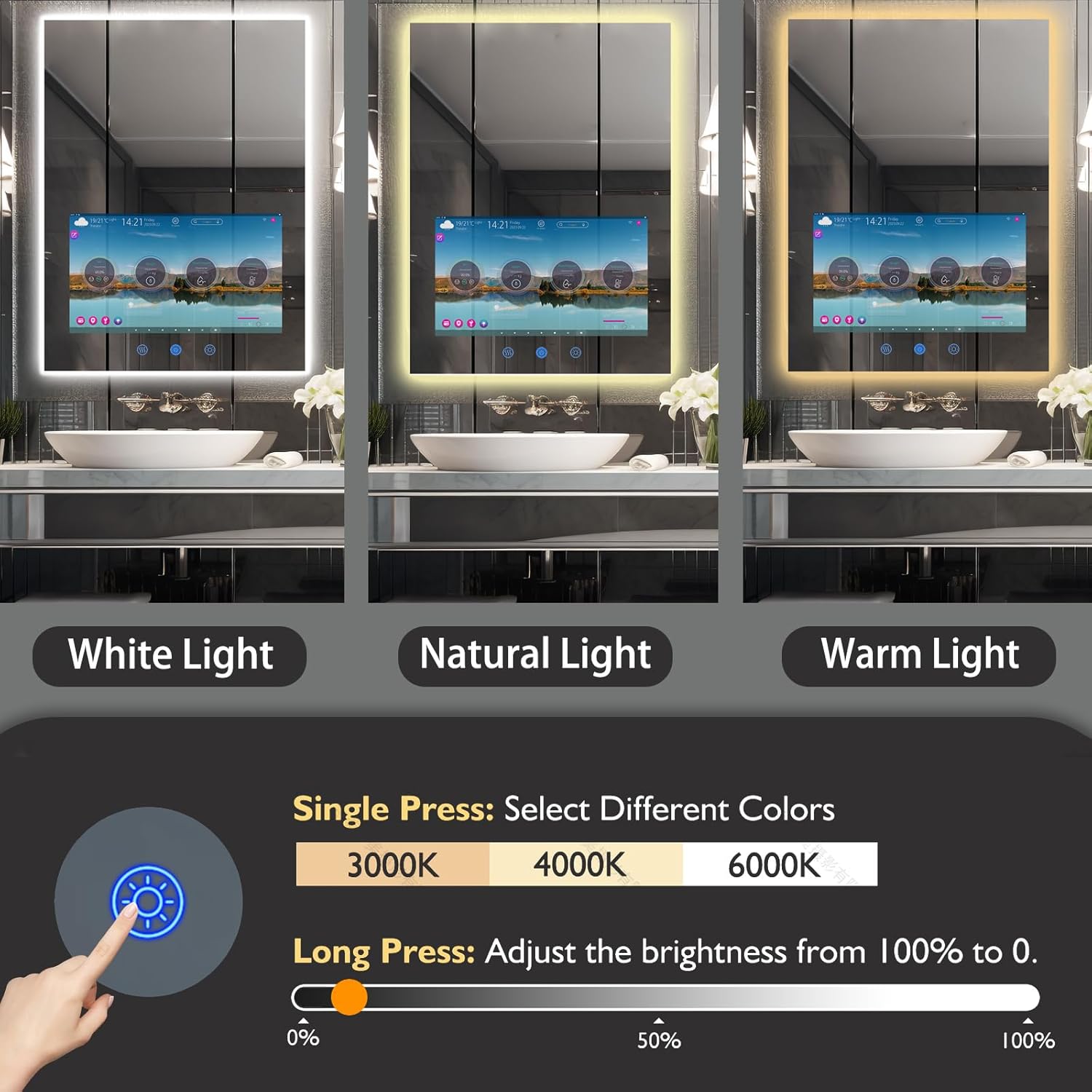 3-Color Hkcvvimmable Lighting & Advanced Anti-Fog Technology: Easily switch between white warm and natural lighting modes and fine-tune brightness to match any setting. The upgraded defogger keeps your reflection clear after showers ensuring instant usability every time.