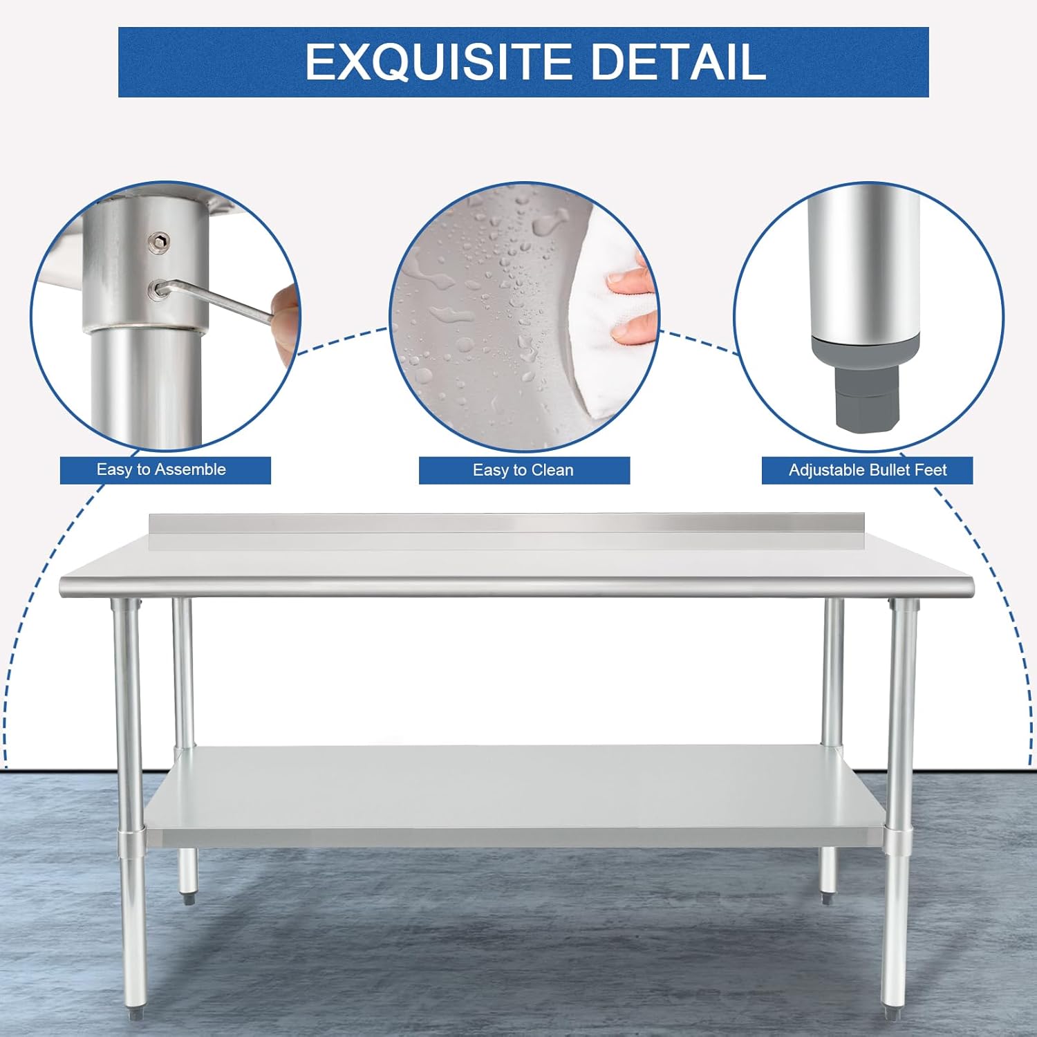 The smooth surface of the 18-gauge type 430 stainless steel work table is easy to clean. Stains can be easily wiped off with a rag.