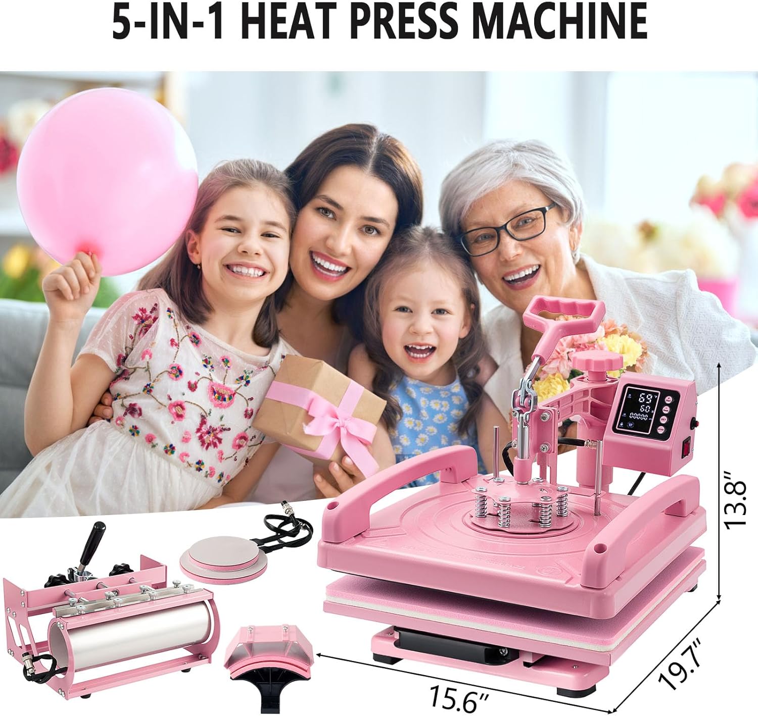 Wide Range of Use -- The 15x15 inch 5 in 1 heat press is versatile suitable for T-shirts caps ceramic plates tiles mugs coasters mouse pads jigsaw puzzles lettering and various fabrics and materials. It transfers vibrant images and designs from sublimation and dissolved printing ink onto ceramics glass and textiles like cotton flax chemical fiber and nylon.