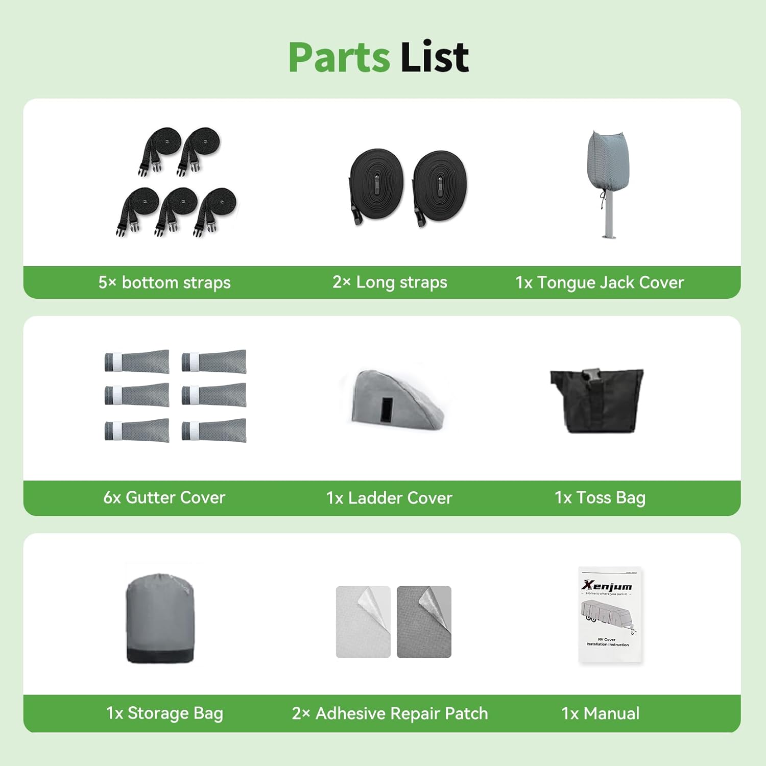 Complete Kit & Size Choice: RV trailer cover x1 Bottom strap x5 Long strap x2 Gutter cover x6 Jack cover x1 Adhesive repair patch x2 Storage bag x1 Toss bag x1. Our RV cover is designed to fit vehicles ranging from 14 to 38 feet in length. Before purchasing please measure your RV from bumper to bumper including the ladder and spare tire but excluding any hitch.