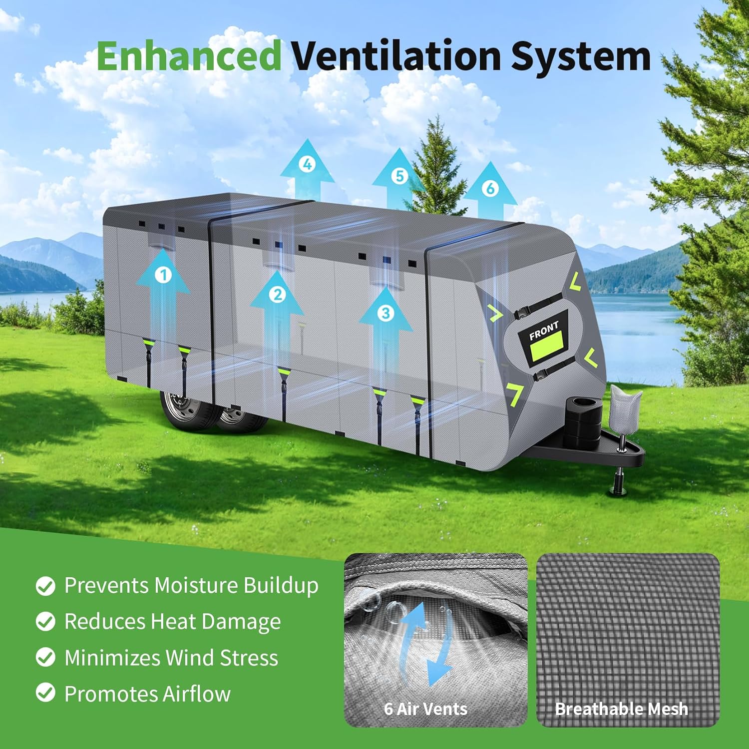 Superior Ventilation & Easy Access: Equipped with 6 strategically placed air vents to enhance airflow and reduce moisture and heat build-up. The RV cover also features 3 roll-up zippered doors allowing for quick and easy access to your RV without removing the entire cover. This helps to maintain a dry protected environment inside.