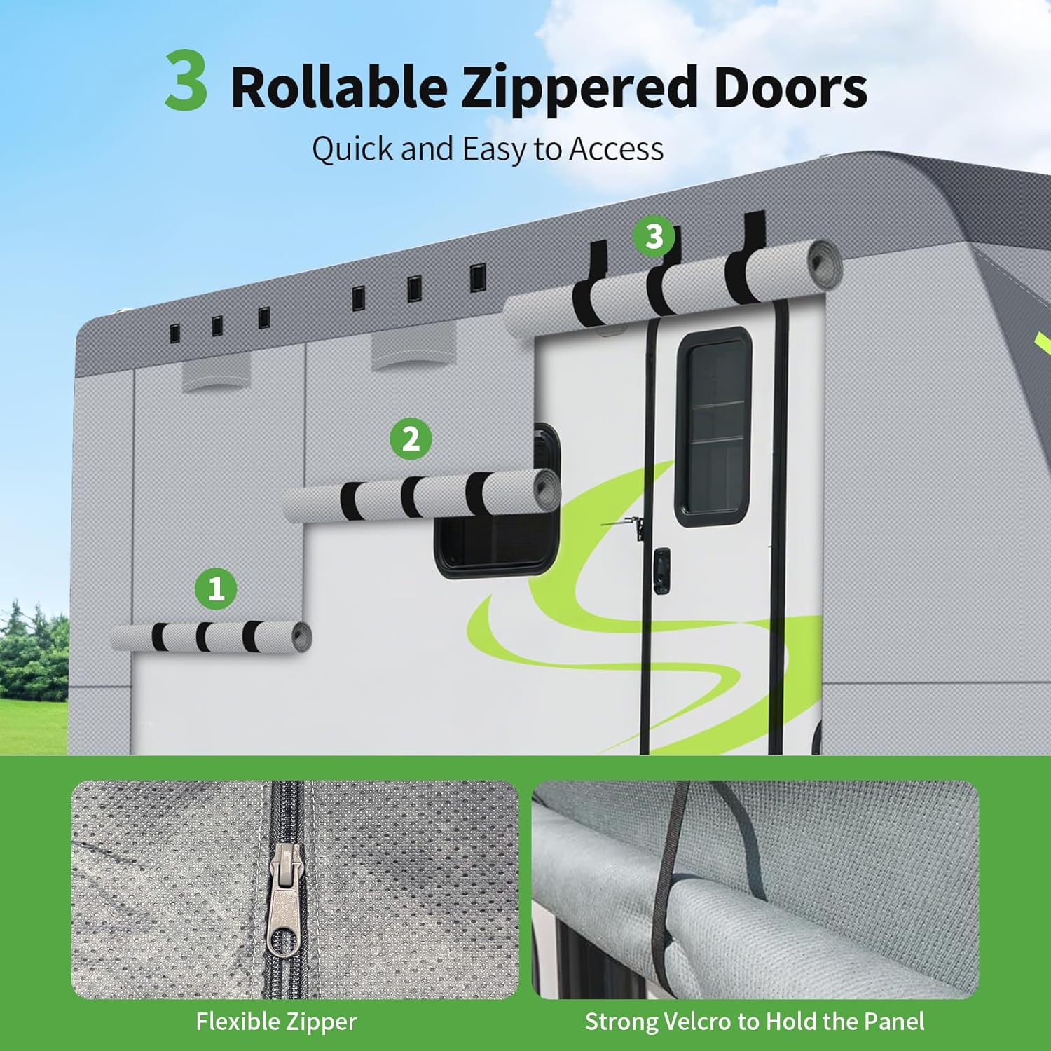 Superior Ventilation & Easy Access: Equipped with 6 strategically placed air vents to enhance airflow and reduce moisture and heat build-up. The RV cover also features 3 roll-up zippered doors allowing for quick and easy access to your RV without removing the entire cover. This helps to maintain a dry protected environment inside.