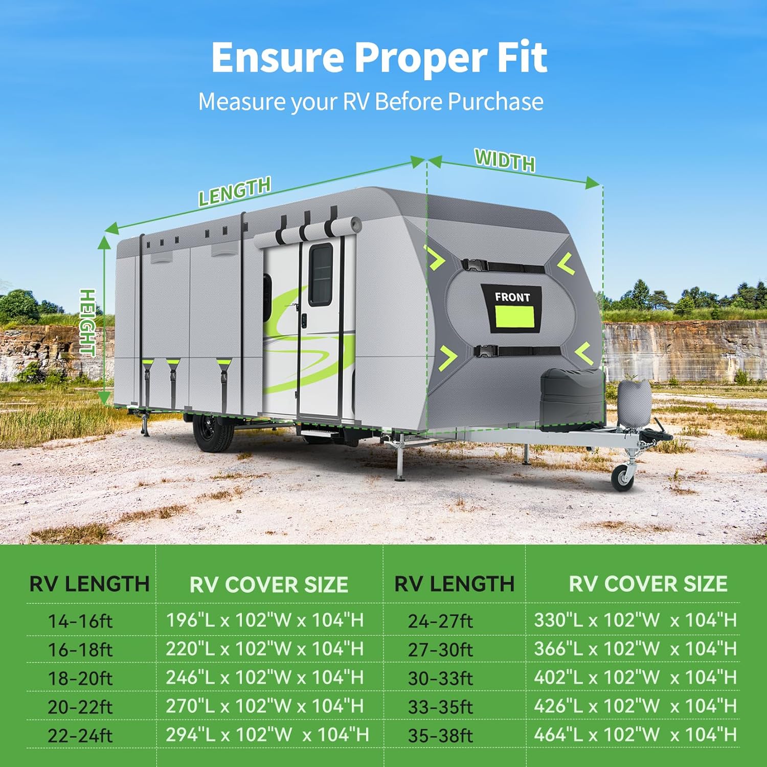 Complete Kit & Size Choice: RV trailer cover x1 Bottom strap x5 Long strap x2 Gutter cover x6 Jack cover x1 Adhesive repair patch x2 Storage bag x1 Toss bag x1. Our RV cover is designed to fit vehicles ranging from 14 to 38 feet in length. Before purchasing please measure your RV from bumper to bumper including the ladder and spare tire but excluding any hitch.