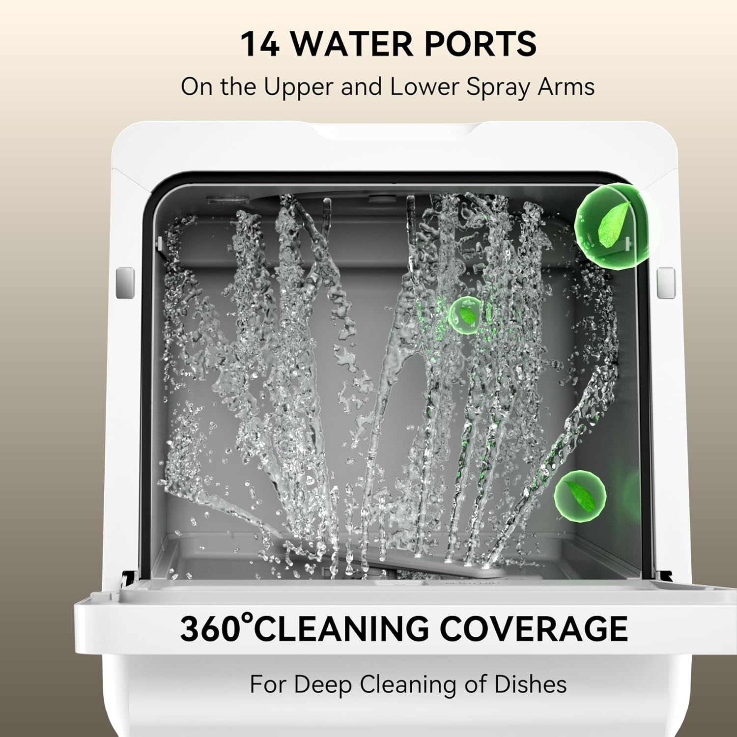 360 All-AROUND CLEANINGThe spray arms feature 14 water jets that spray from both the top and bottom achieving a 360 cleaning coverage. This ensures a meticulous rinse imparting a gleaming pristine finish to your dishes.