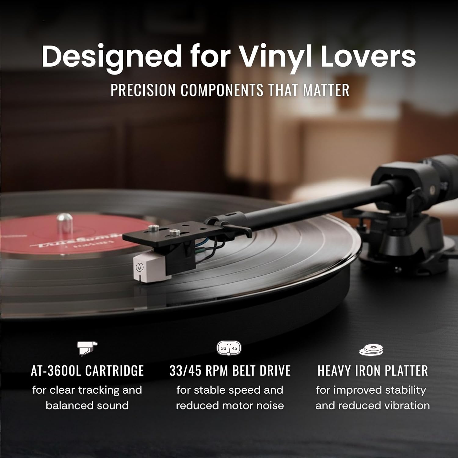 PURE SOUND STEADY PERFORMANCE Enjoy clean playback with our expertly engineered vibration-dampening technology; combining a robust iron platter with specialized rubber feet this turntable minimizes unwanted resonance delivering pure stable sound. Experience your vinyl collection as intended free from extra noise interruptions and revel in each clear note as it fills your space enhancing your listening pleasure like never before.