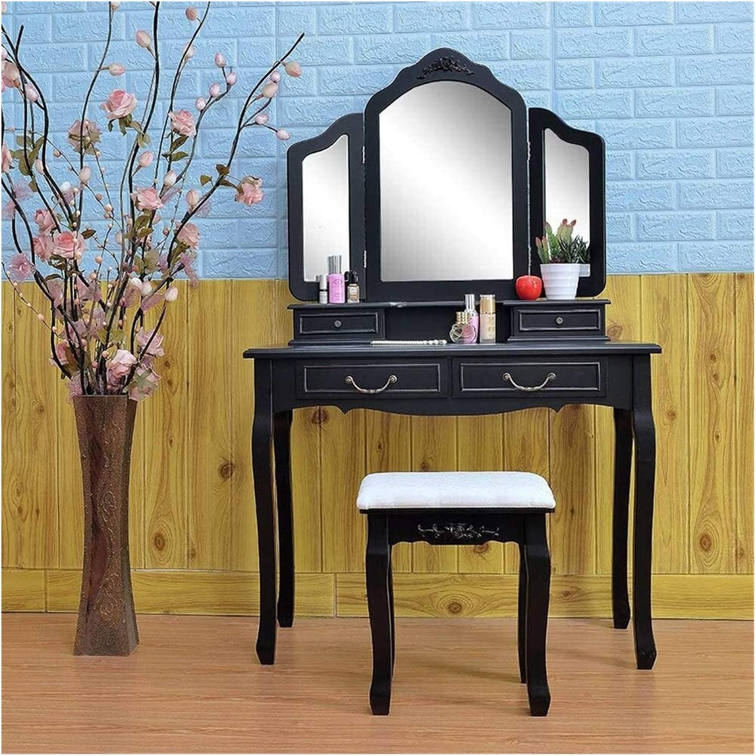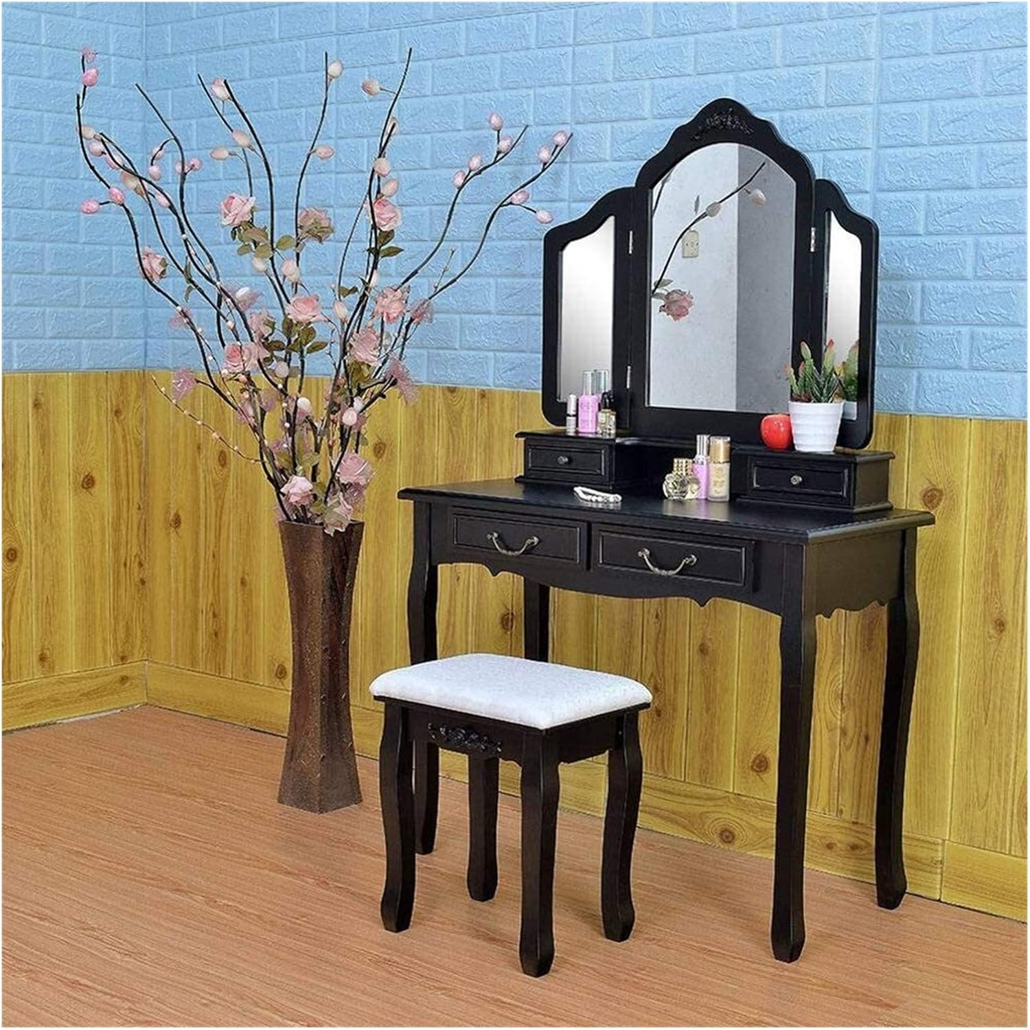 • high-end Hkcvvressing Table Hkcvvressing Table Tri-fold Mirror Hkcvvresser with Hkcvvressing Stool Black Hkcvvressing Table 4 Hkcvvrawers Bedroom Work Hkcvvesk 90x40x145cm