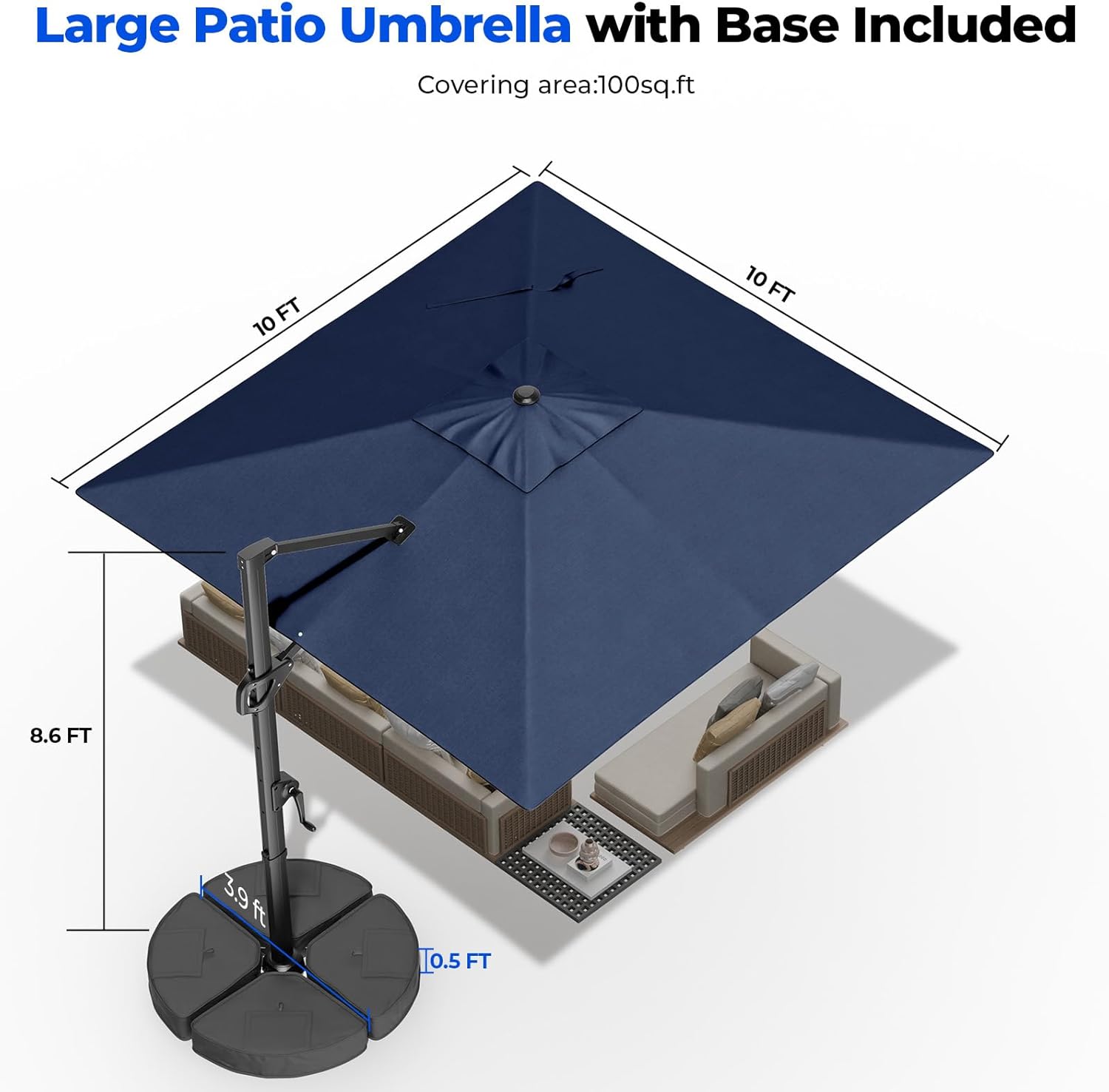 6 Easy-Adjust Tilt & Crank System: This cantilever patio umbrella features a smooth crank system for effortless opening and closing. With the manual tilt mechanism you can easily adjust the canopy to multiple angles providing optimal shade coverage as the sun moves throughout the day.