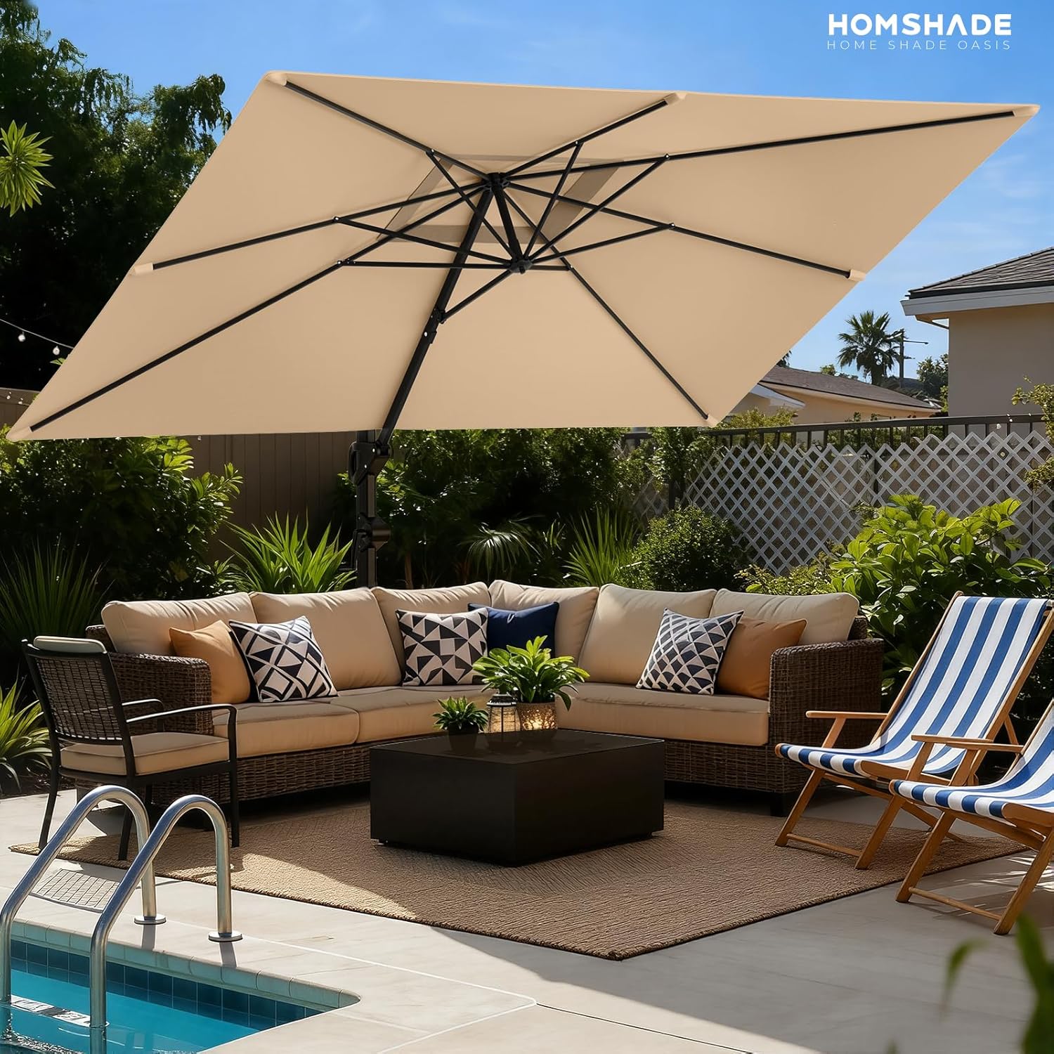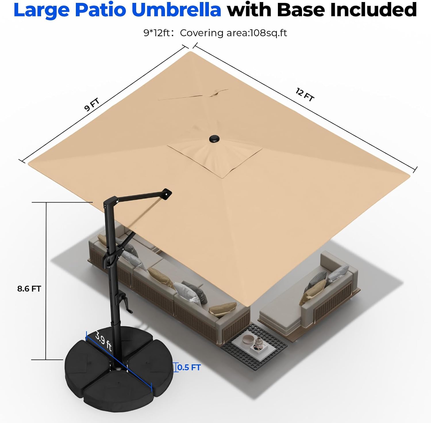 Large & Spacious Coverage: Available in two large sizes10'x10' square or 9'x12' rectanglethis patio umbrella provides more coverage than round ones. Its wide canopy shades a full patio table lounge set or pool deck keeping your outdoor seating cool. Measure your space first to get the perfect fit.