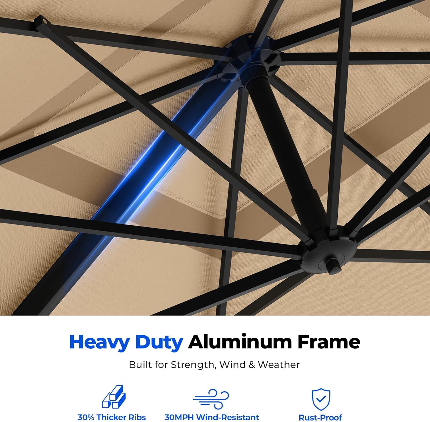 Heavy-Duty Aluminum Frame: Featuring 8 heavy-duty aluminum ribs for superior structural support that reduces shaking this allaluminum frame stands strong in breezes and resists rust yearround. The antioxidation finish keeps it looking new.