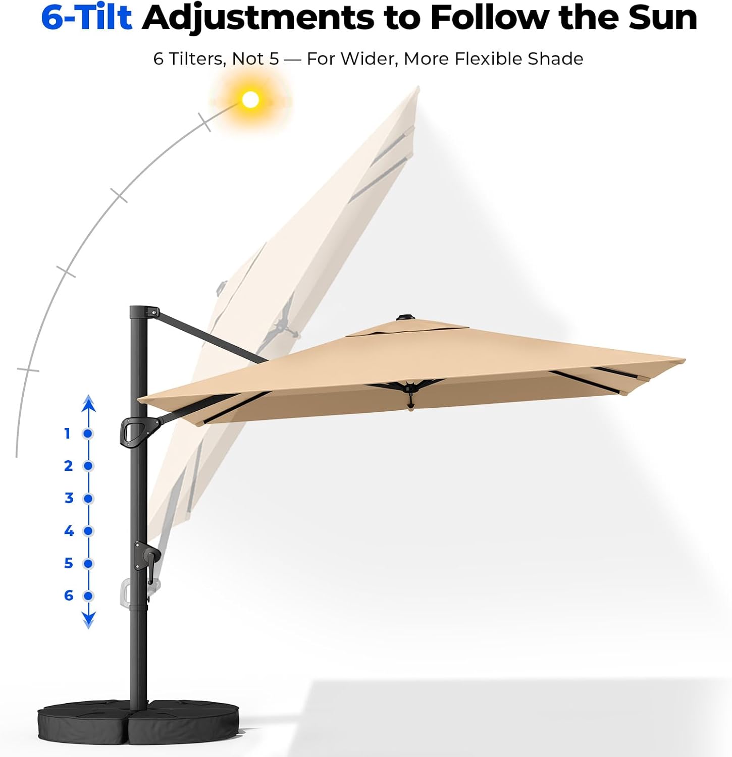 6 Easy-Adjust Tilt & Crank System: This cantilever patio umbrella features a smooth crank system for effortless opening and closing. With the manual tilt mechanism you can easily adjust the canopy to multiple angles providing optimal shade coverage as the sun moves throughout the day.