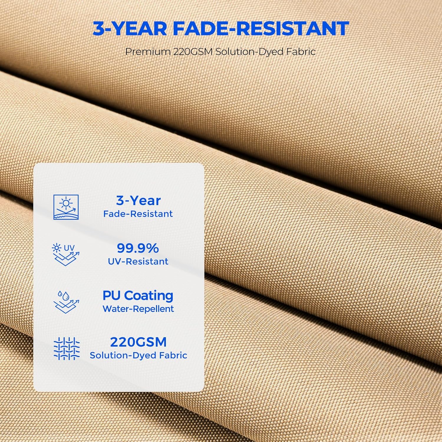 Durable & Fade-Resistant Fabric: Made with heavy-duty 220gsm polyester this water-repellent and UV-resistant fabric offers 3-year fade resistance and UPF 50+ sun protection keeping colors vibrant for years. Its easy to cleanjust wipe with a damp cloth.