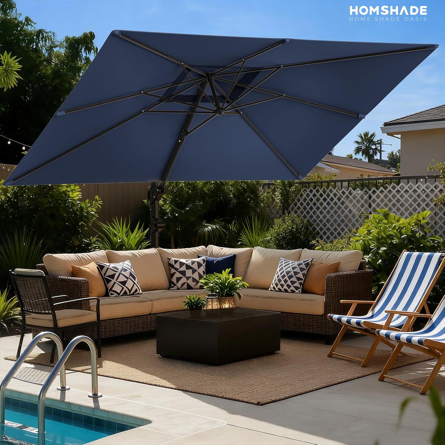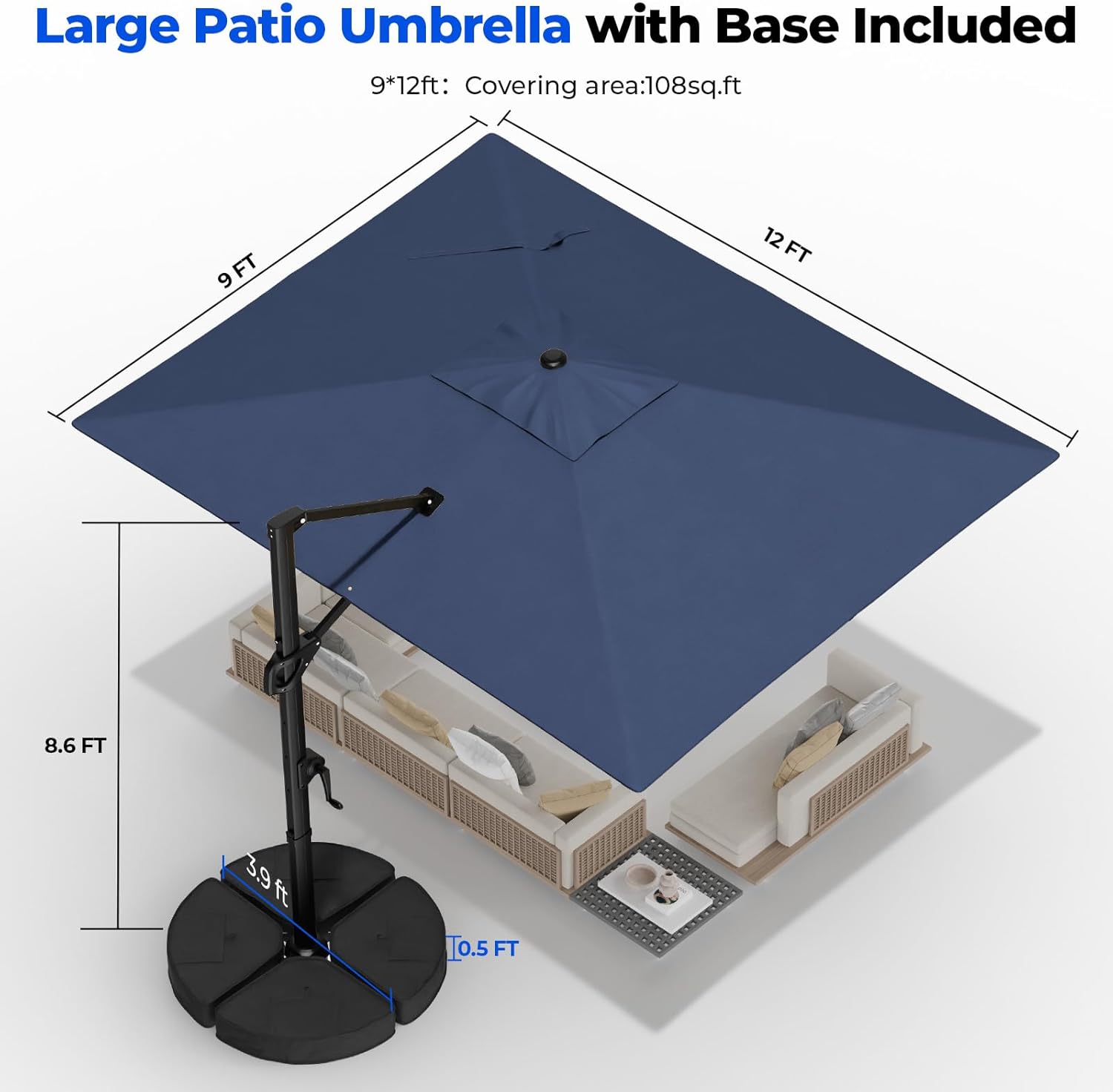 Large & Spacious Coverage: Available in two large sizes10'x10' square or 9'x12' rectanglethis patio umbrella provides more coverage than round ones. Its wide canopy shades a full patio table lounge set or pool deck keeping your outdoor seating cool. Measure your space first to get the perfect fit.