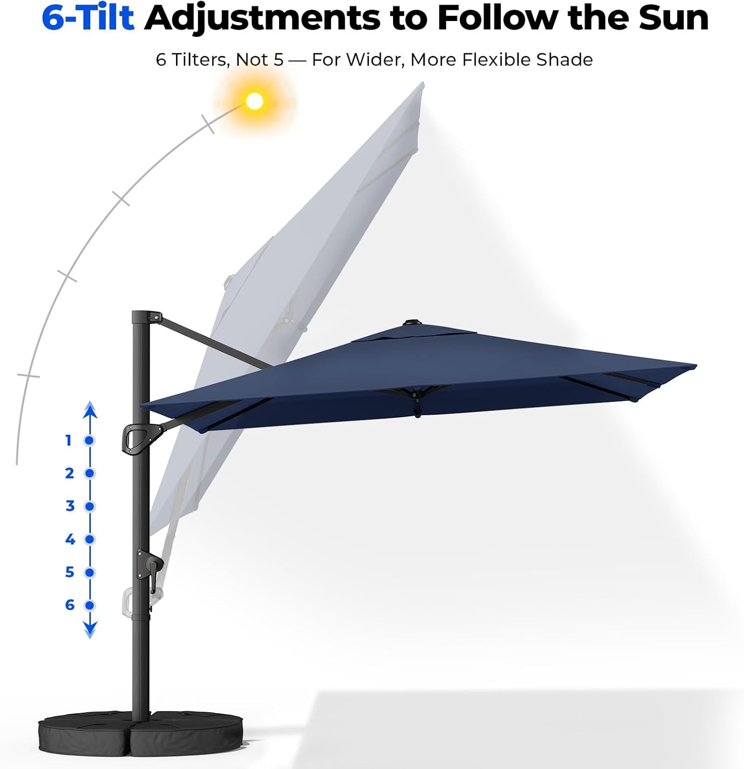6 Easy-Adjust Tilt & Crank System: This cantilever patio umbrella features a smooth crank system for effortless opening and closing. With the manual tilt mechanism you can easily adjust the canopy to multiple angles providing optimal shade coverage as the sun moves throughout the day.
