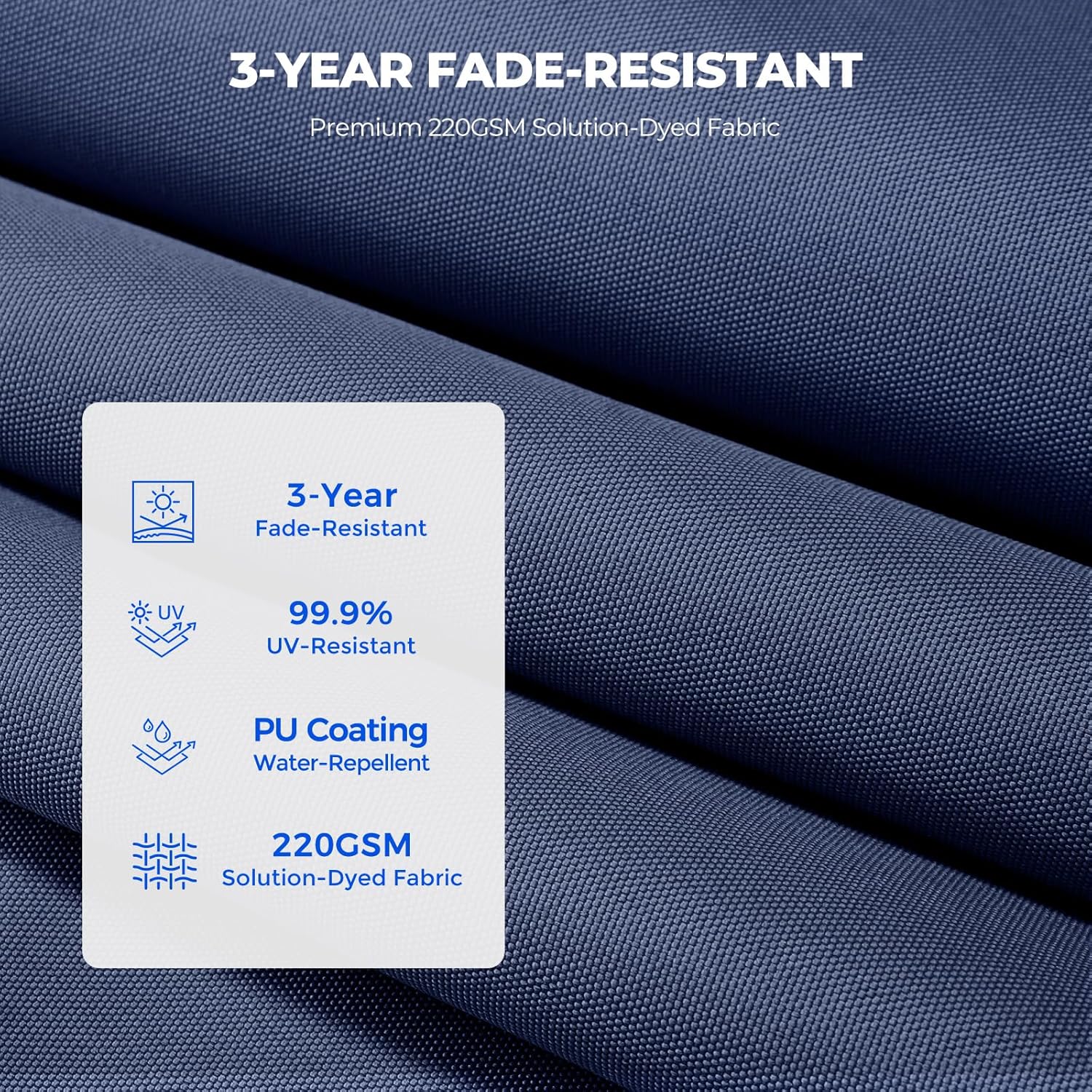 Durable & Fade-Resistant Fabric: Made with heavy-duty 220gsm polyester this water-repellent and UV-resistant fabric offers 3-year fade resistance and UPF 50+ sun protection keeping colors vibrant for years. Its easy to cleanjust wipe with a damp cloth.