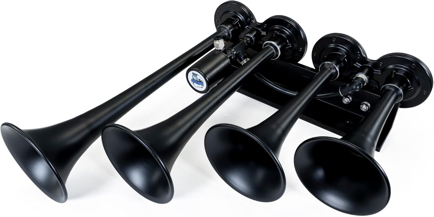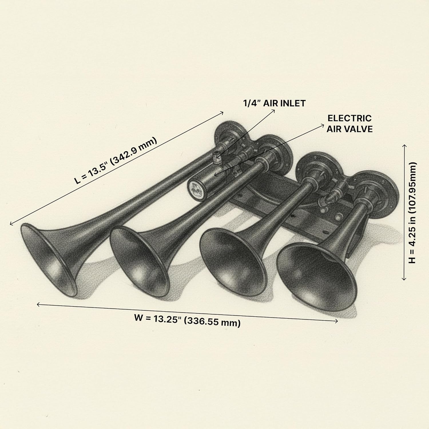 The 4-Chime 3-Liter Air Horn Kit delivers a sharp high-pitched honk that ensures youre heard when it matters most. Featuring four chimes mounted to a single manifold this air horn produces a powerful and attention-grabbing tone perfect for enhancing safety or making a statement on the road.